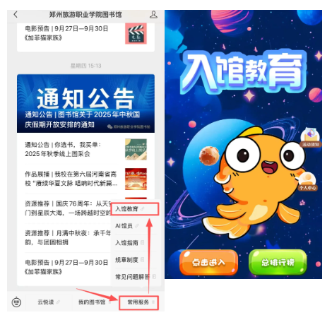1.关注郑州旅游职业学院微信公众号(扫描下方二维码),选择“常用服务”,点击“新生入馆教育”。即可跳转至统一身份认证平台登录界面,使用统一身份认证账号密码登录。找到首页“入馆教育”应用,完善个人信息后即可进入活动。