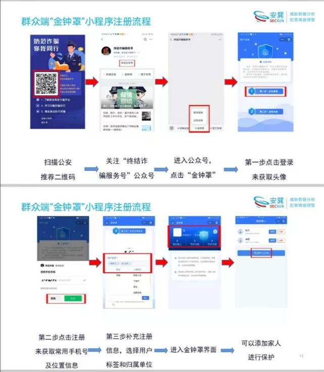 微信扫描豫兴路派出所民警生成的二维码→关注“终结诈骗服务号”公众号→进入公众号,点击“金钟罩”→第一步点击登录来获取头像→第二步点击注册来获取常用手机号及位置信息→第三步补充注册信息,选择用户标签和归属单位→进入“金钟罩”页面→可以添加家人进行保护。