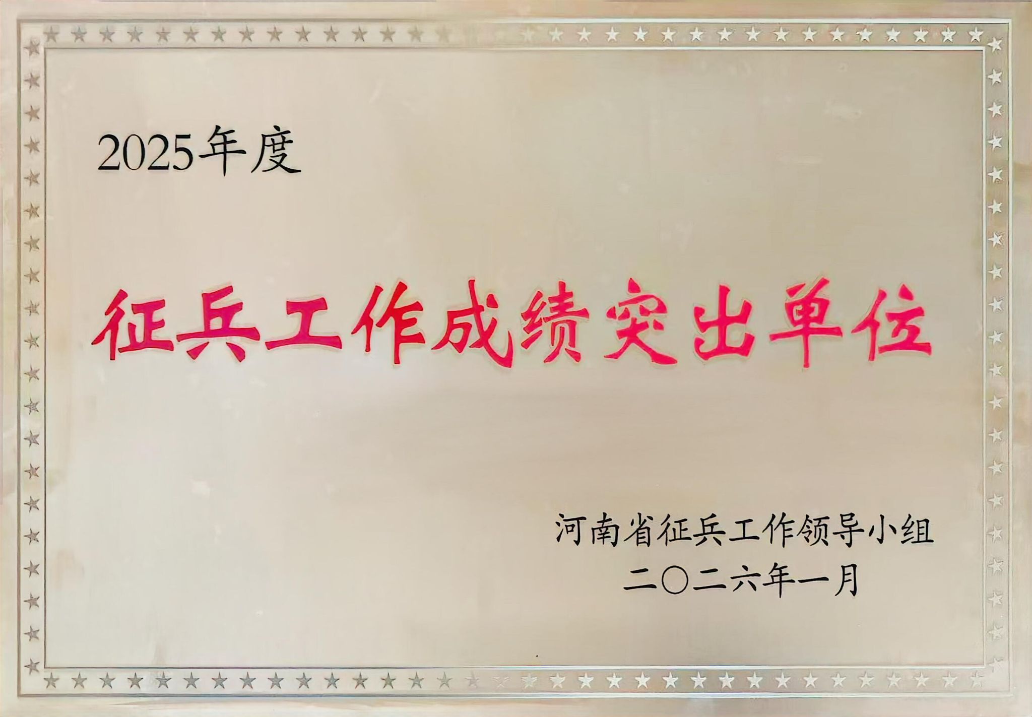 近日,河南省征兵工作领导小组印发《关于表扬2025年河南省征兵工作成绩突出单位和个人的通报》(豫征〔2026〕1号),对一批在征兵工作中表现优异的单位和个人予以表彰。我校因征兵工作扎实、成效显著,荣获“2025年河南省征兵工作成绩突出单位”称号。