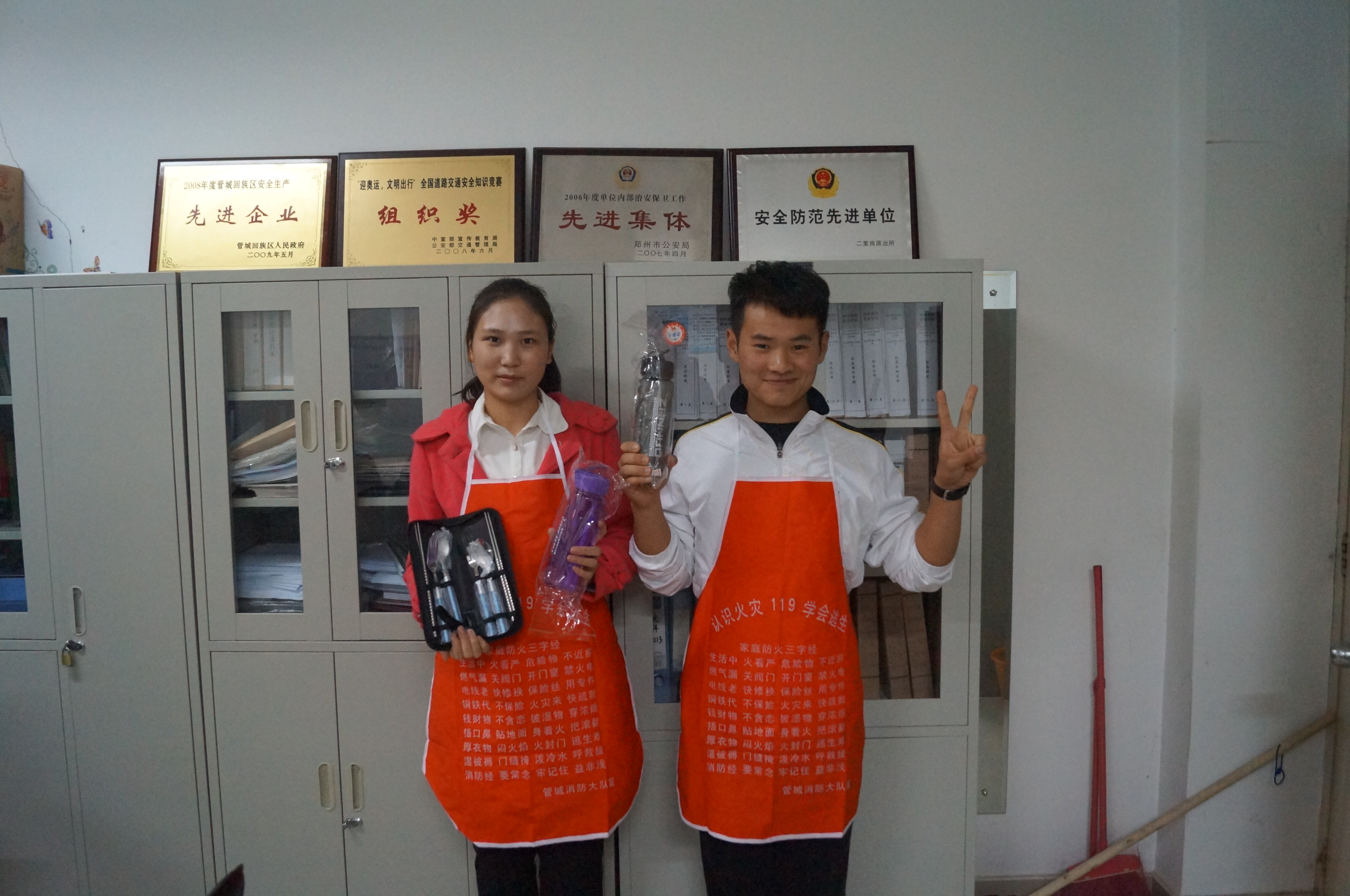 2014年11月6日下午4时,我院陶小虎老师带领校卫队刘也剑、郭丽艳两名学生代表学校参加了由郑州市管城区公安消防支队在百盛购物广场一楼大厅组织的“消防我来“话”活动”。并在活动中知识竞赛环节取得了第一名、第二名的优异成绩。