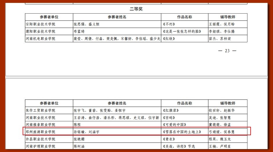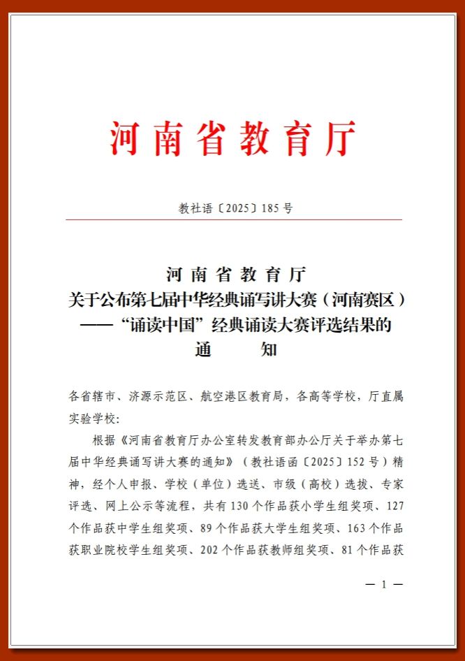 近日,由河南省教育厅主办、以“传承中华经典,筑牢文化根基”为主题的第七届中华经典诵写讲大赛(河南赛区)评选结果正式揭晓。我校选送的参赛作品凭借深厚的文化内涵与出色的艺术表现力脱颖而出,一举斩获两项重要荣誉,充分展现了学校在文化育人领域的扎实成果与师生良好的专业素养。