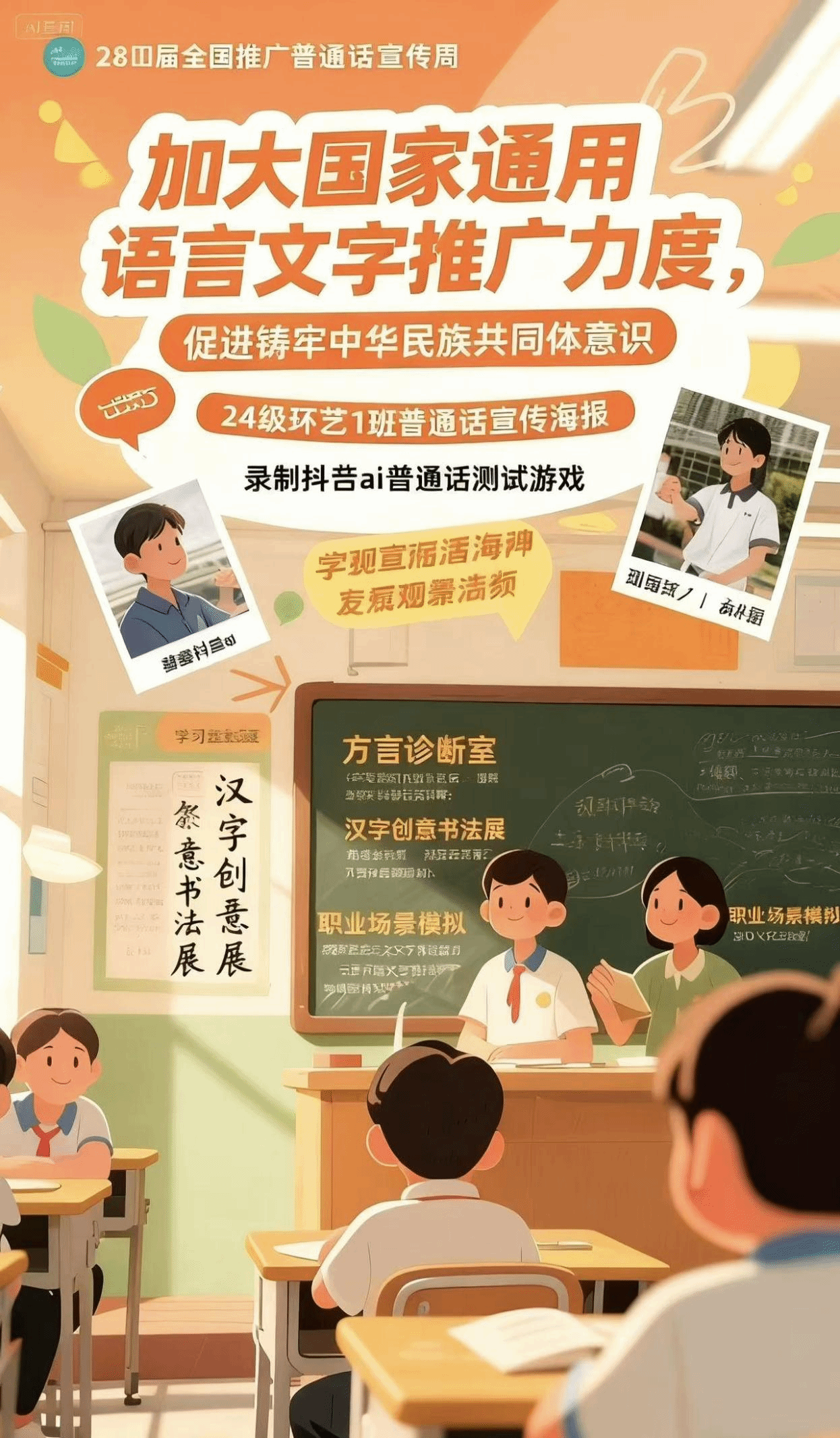 谁说推普只能中规中矩?数字文创学院的板报设计数字感十足,酒店管理学院则推出“成语探华夏”演讲擂台,班会不再是“你说我听”,而是全员参与、脑洞大开的语言嘉年华!
