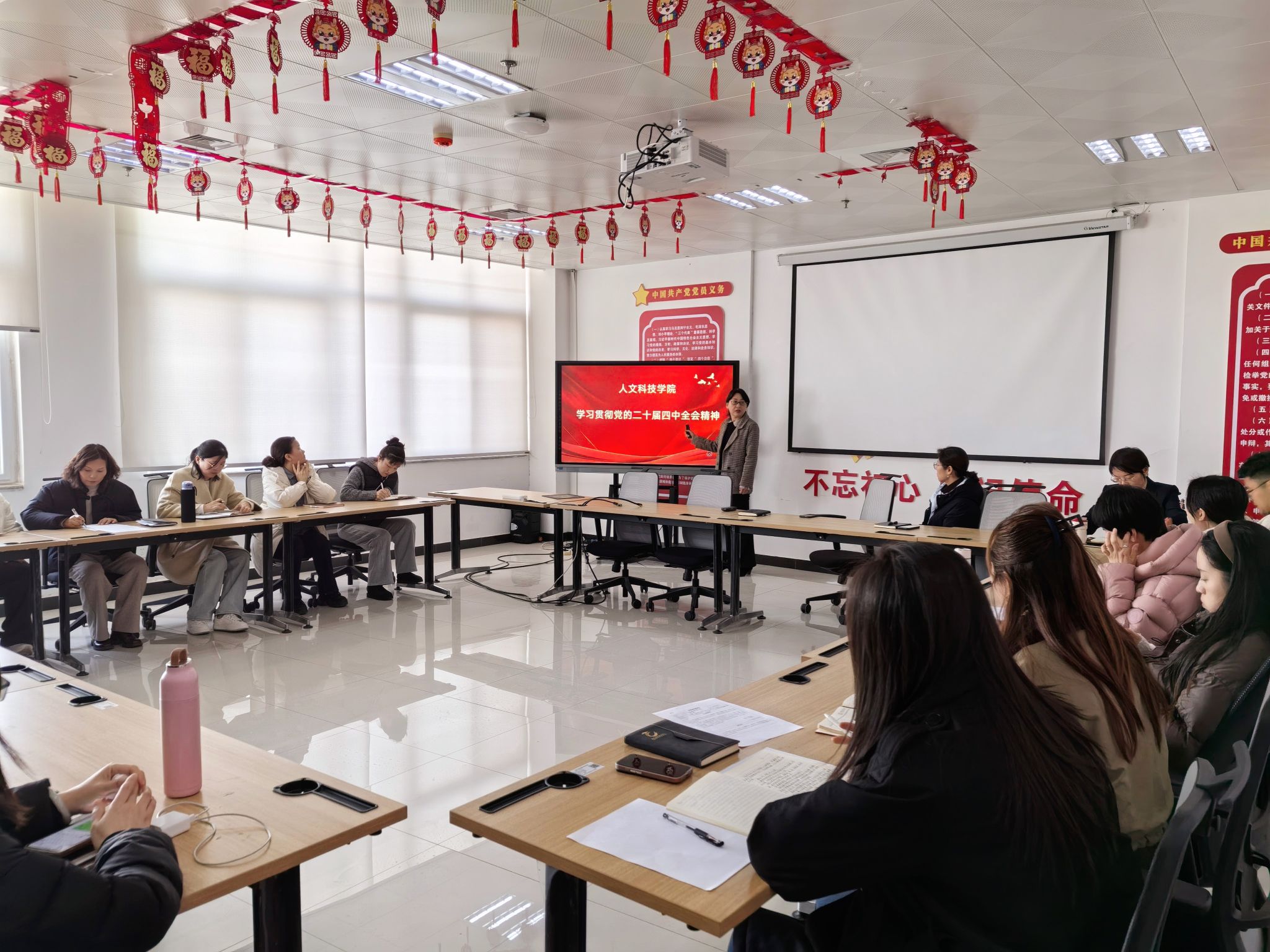 12月24日,人文科技学院在行政楼705召开学习贯彻党的二十届四中全会精神专题学习宣讲会。学院党总支书记李海燕以《深悟党的二十届四中全会精神,认真抓好贯彻落实》为题,为全体教师讲授专题党课。