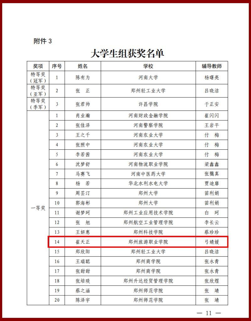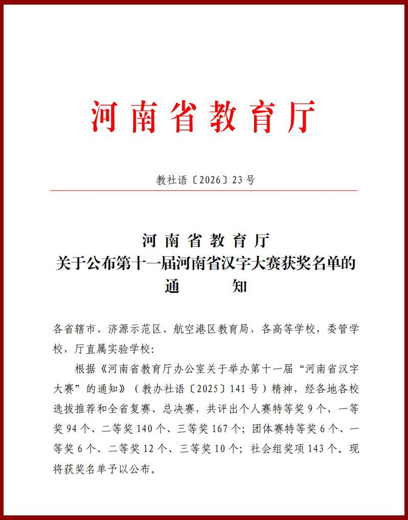 近日,河南省教育厅印发《关于公布第十一届河南省汉字大赛获奖名单的通知》,由我校人文科技学院教师弓婧媛指导的学生崔天正、苏铭哲、张学涵在大赛中表现优异,分别荣获大学生组一等奖和三等奖。
