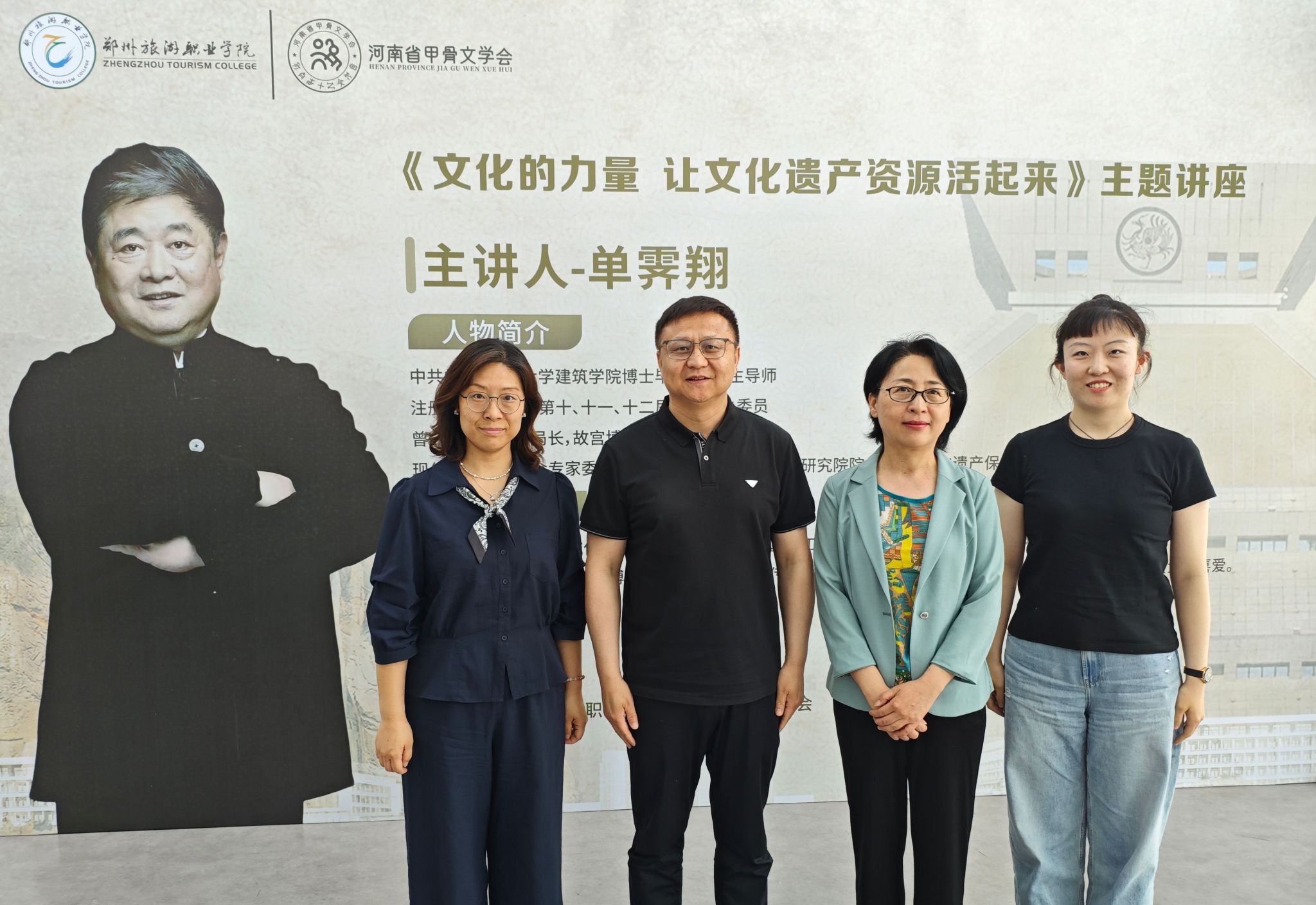 4月18日,由郑州旅游职业学院与河南省甲骨文学会联合主办的“文化的力量:让文化遗产资源活起来”主题讲座在郑州旅游职业学院象湖校区艺术中心隆重举行。国家文物局原局长、故宫博物院原院长、中国文物学会专家委员会主任单霁翔应邀开讲。人文科技学院班子成员和部分教师代表参加活动,与近1500名领导、专家及师生代表共飨文化盛宴。