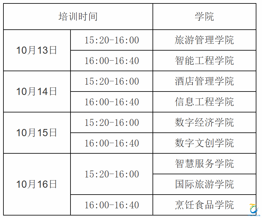 具体培训时间安排如下(每场培训须提前10分钟到场签到):