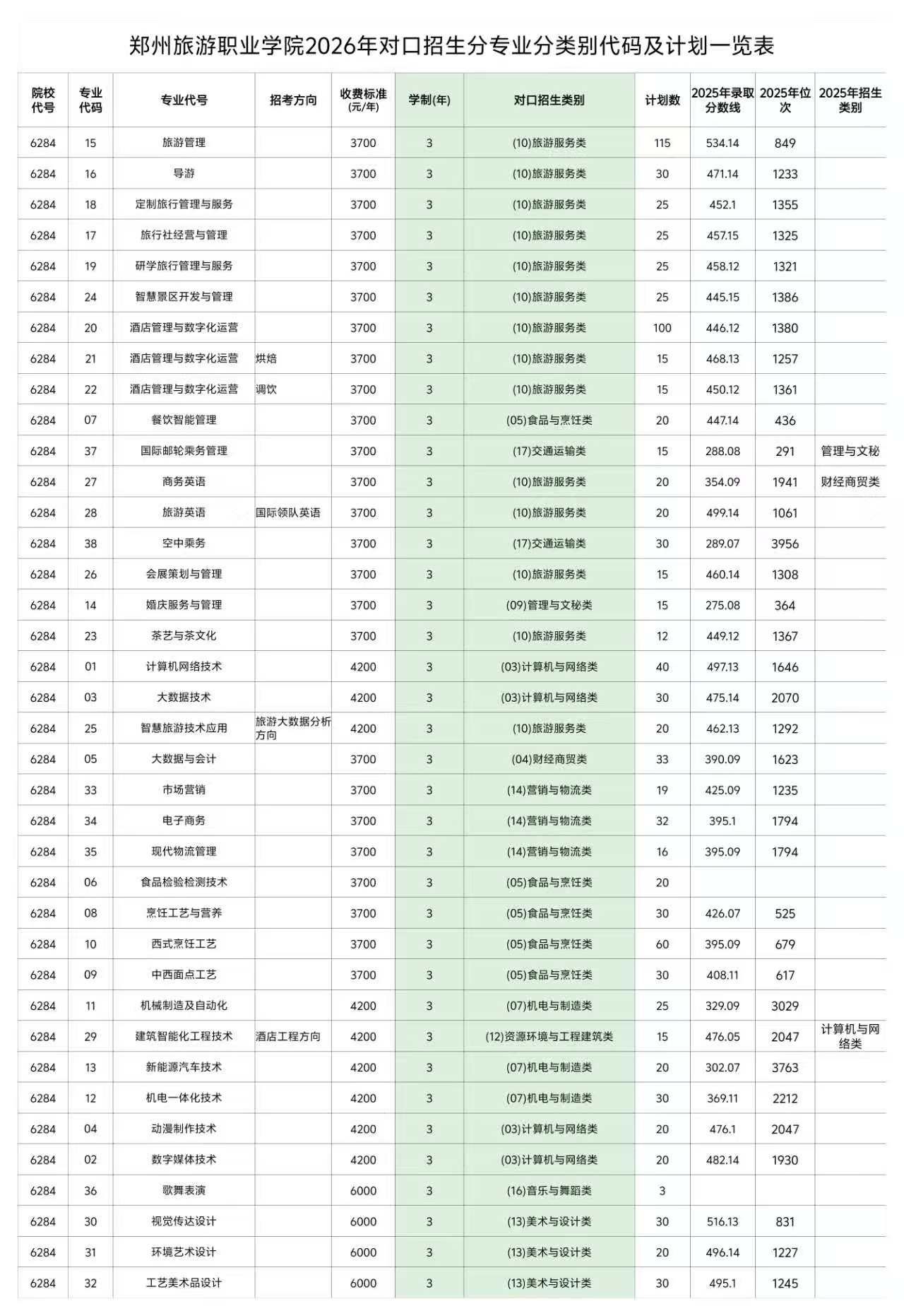 郑州旅游职业学院2026年对口招生分专业分类别代码及计划一览表