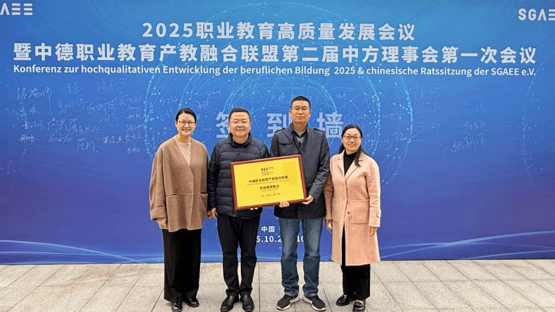 会议期间,我校代表团与全国职业教育界专家、学者及行业代表深入交流,积极分享学校在国际化办学与实践育人方面的经验与成果。经大会审议通过,我校被正式增补为中德职业教育产教融合联盟常务理事单位,并获授“中德智慧康养产业学院试点培育单位”。这两项重要成果,标志着我校在推进职业教育国际化与产教融合方面取得实质性进展,为未来深化校企资源共建、推动人才培养模式创新奠定了坚实基础。