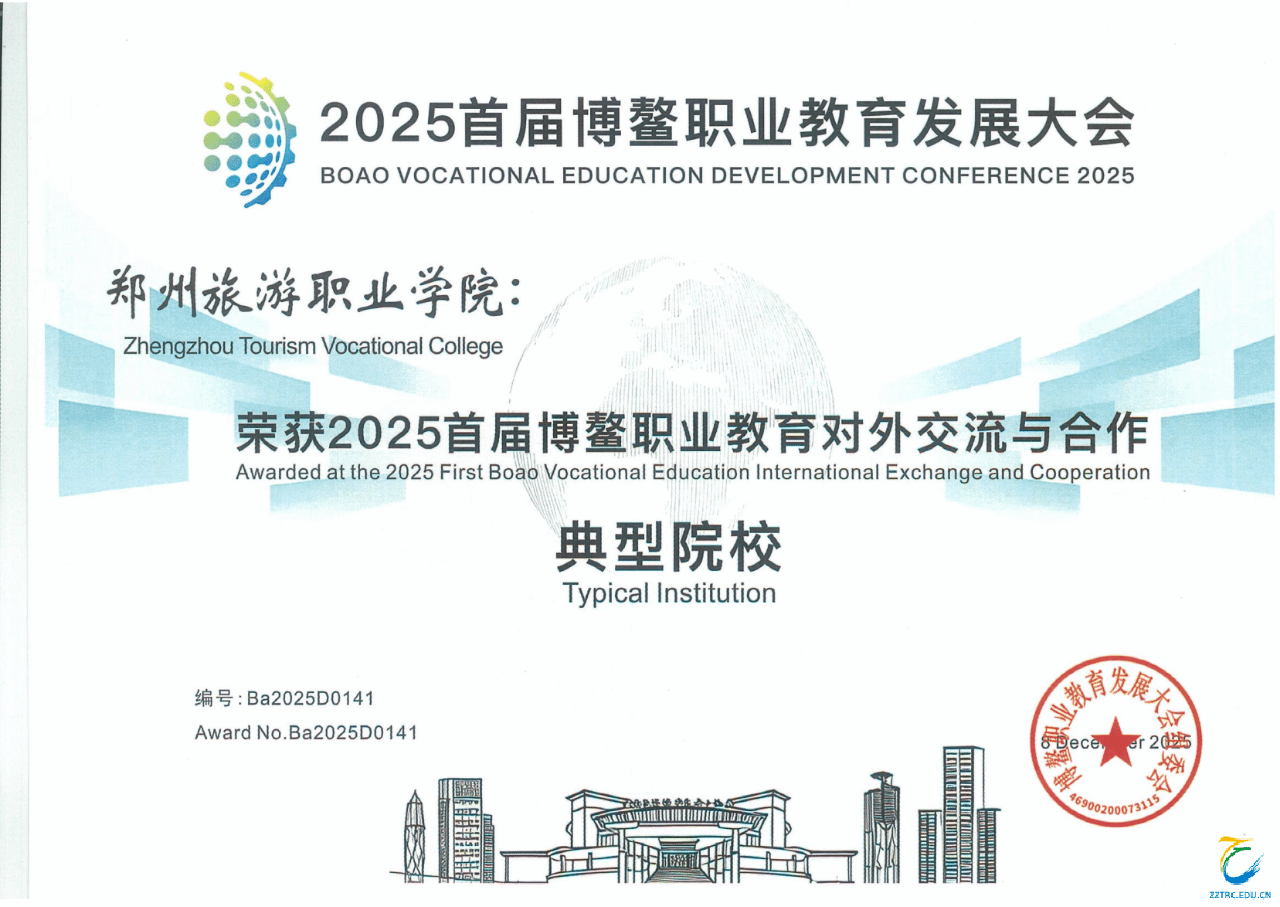 近日,在海南博鳌亚洲论坛国际会议中心举办的2025首届博鳌职业教育发展大会圆满落幕。我校凭借在职业教育国际化、产教融合深化及人文交流推进中的突出贡献与创新实践,被大会组委会授予 “2025 首届博鳌职业教育对外交流与合作典型院校” 称号;学校报送的《文旅强国背景下的郑旅实践与思考》案例,成功入选大会职业教育对外交流与合作优秀案例名单。
