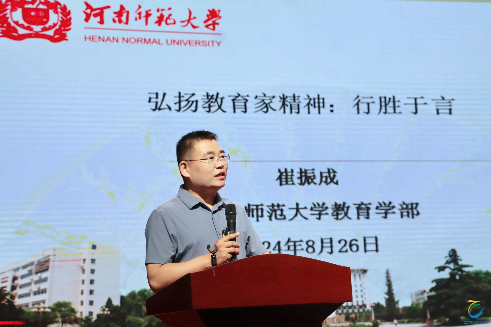 8月26日下午,河南师范大学崔振成教授围绕教育家精神,作了题为《弘扬教育家精神:行胜于言》的讲座。崔教授阐释了中国特有的教育家精神内涵,从国家、人才培养、教师职业3个方面提出教育家精神的叙事逻辑,并从认同教师身份、构建教师课程素养、发展教师教学素养、生成教师管理素养等几个方面,提出了弘扬教育家精神的实践路径。