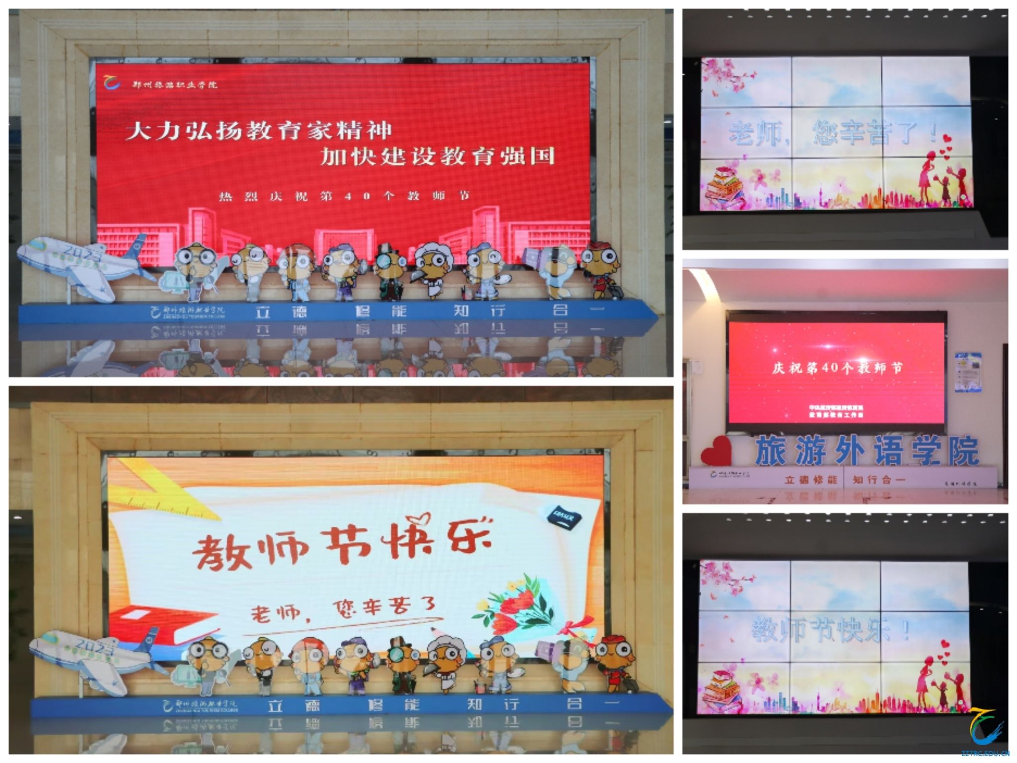 各二级学院利用LED屏幕滚动播放“老师,您好!”“教师节快乐”“老师,您辛苦了”等教师节标语,营造出尊师重教浓厚氛围,温暖每一位教师的心,激励广大教师和教育工作者自信自强、踔厉奋发,为强国建设、民族复兴伟业作出贡献。
