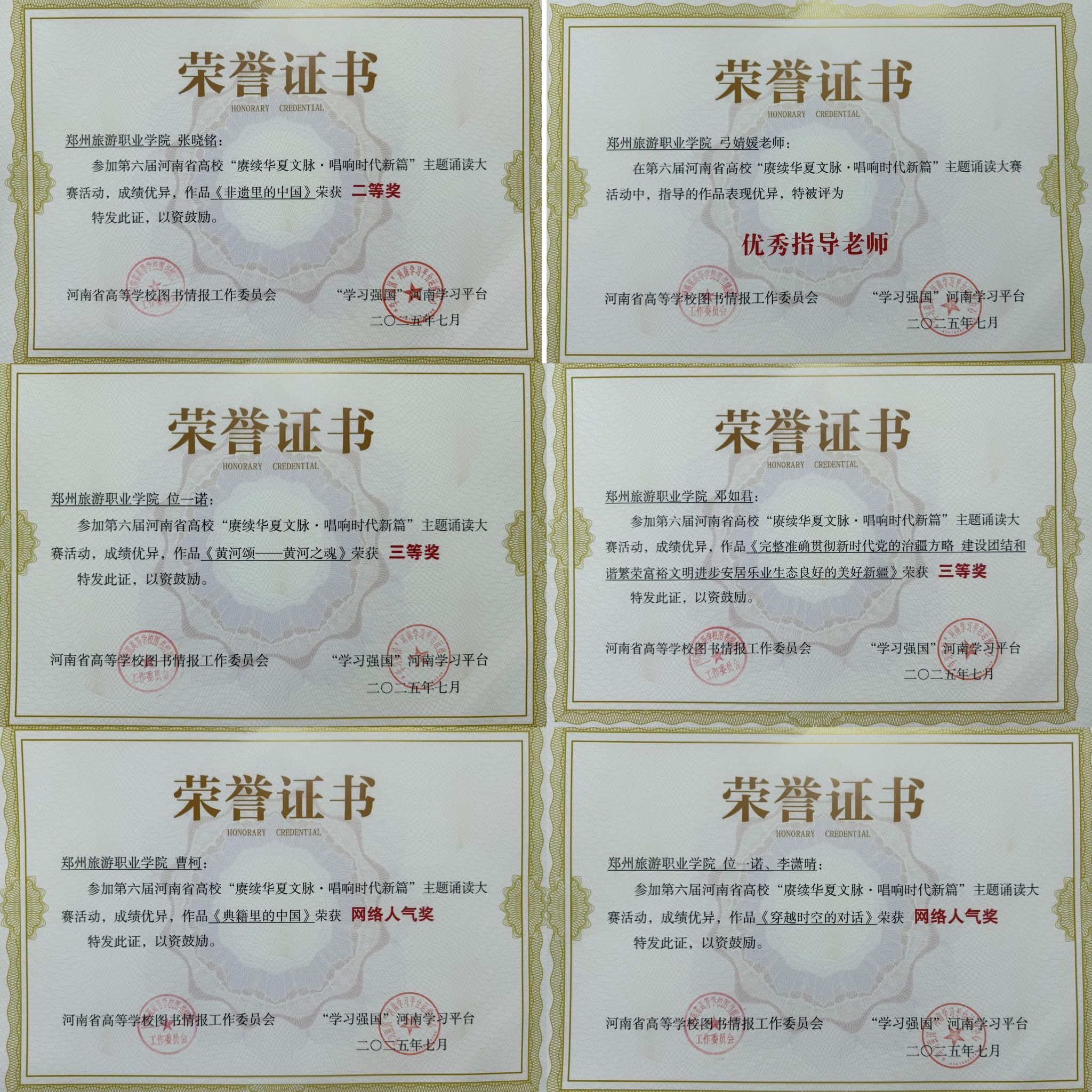 近日,由河南省高等学校图书情报工作委员会、“学习强国”河南学习平台主办的第六届河南省高校“赓续华夏文脉·唱响时代新篇”主题诵读大赛圆满落幕,我校师生在此次大赛中喜获佳绩,斩获多项大奖,充分展现了我校学生的文学素养和诵读能力。我校学生张晓铭荣获二等奖,位一诺、邓如君荣获三等奖,曹柯、位一诺、李潇晴荣获网络人气奖,教师弓婧媛荣获优秀指导老师。