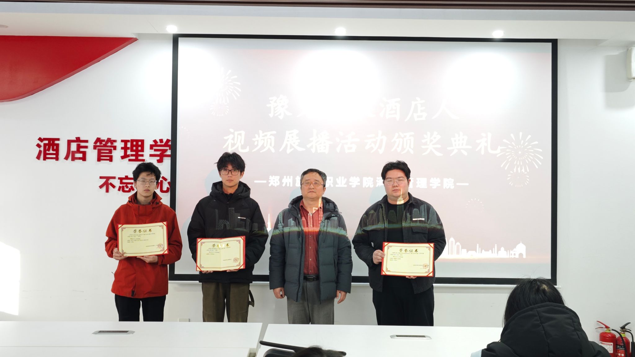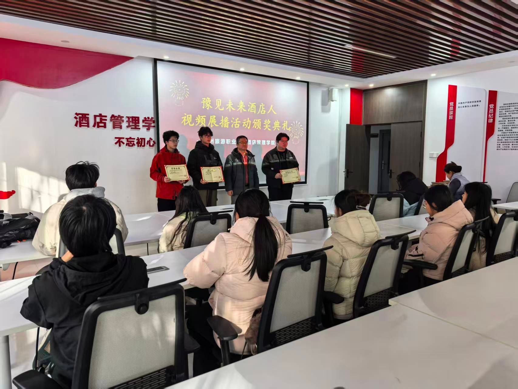 为深化专业建设内涵、展现育人成效,酒店管理学院联合河南日报社顶端新闻共同举办的“豫”见未来酒店人微视频展播活动于近日圆满落幕。活动自启动以来,得到全院师生积极响应,共征集作品30余件,经网络点赞与专家评审,最终评选出一等奖3项、二等奖5项、三等奖7项,1月12日下午,酒店管理学院党总支书记郭防为获奖学生颁奖。