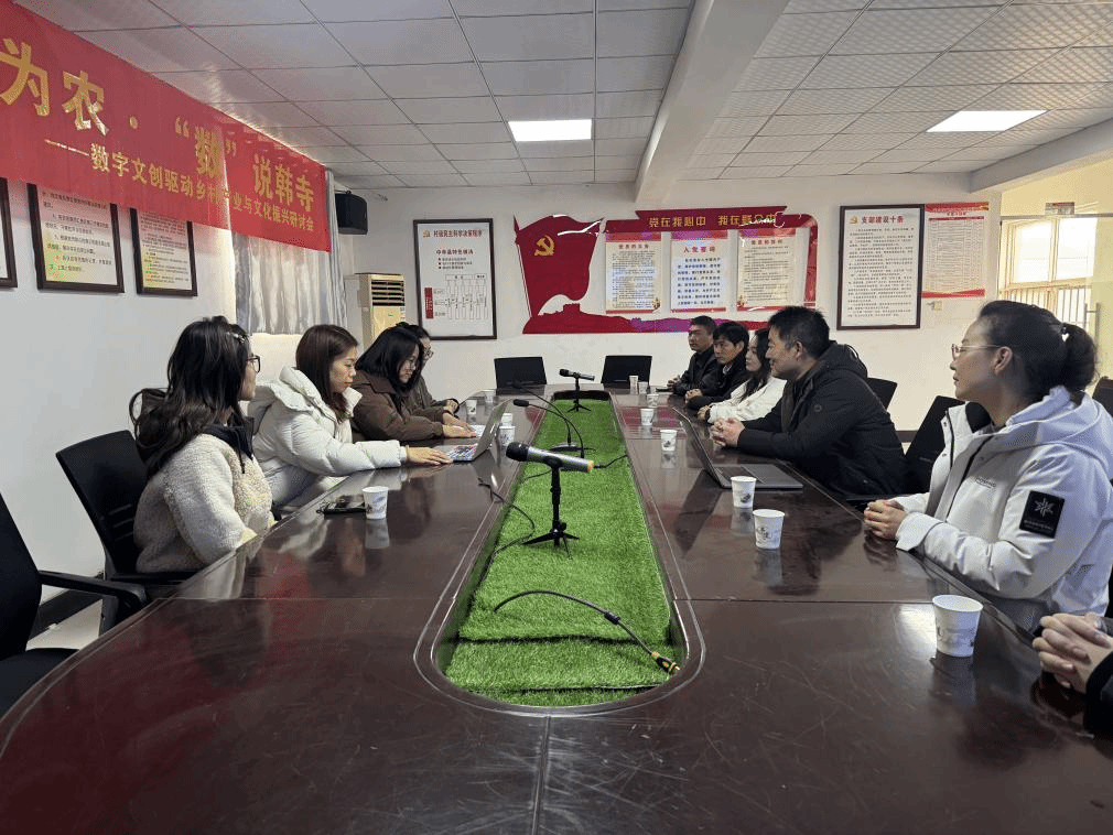 为深入贯彻河南省委教育工委、省教育厅“牢记嘱托践使命 行走中原看巨变”主题思政教育实践活动精神,引导广大青年学生沉浸式感受新时代伟大变革的磅礴实践,深刻理解中国式现代化理论的科学内涵与河南实践,1月18日下午,数字文创学院师生在党总支书记杨慧丽的带领下赴中牟县韩寺镇,举行“艺心为农·数说韩寺——数字文创驱动乡村产业与文化振兴研讨会”,充分发挥高校学科与专业优势服务地方经济发展,以数字文创力量助力当地特色农业品牌建设与产业升级。中牟县韩寺镇常务镇长刘新征,韩寺镇宣传委员、副镇长路思睿与荣庄村支部相关干部参加探讨会并对数字文创学院党总支一行表示热烈欢迎。