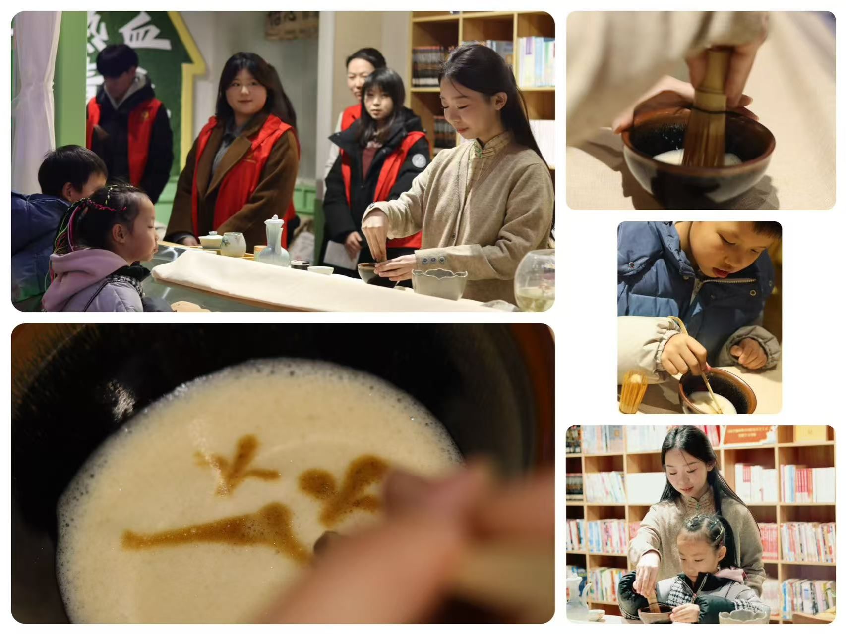 活动现场,志愿者展示了宋代点茶技艺——一名志愿者进行技艺示范,完整呈现调膏、击拂、分茶的全流程,另一名志愿者在旁进行讲解点茶的历史和“雪沫乳花”的风雅意境。茶筅在茶盏中上下翻飞,细腻的抹茶粉逐渐化作绵密如雪的茶沫,生动再现了宋韵风雅,让居民直观感受非遗技艺的独特魅力。志愿者还邀请现场小朋友参与其中,手把手指导孩子们掌握茶筅击拂技巧和点茶的乐趣。孩子们兴致盎然,在互动中沉浸式触摸传统文化,领略千年茶事的趣味与温度。