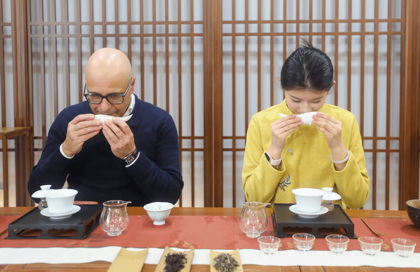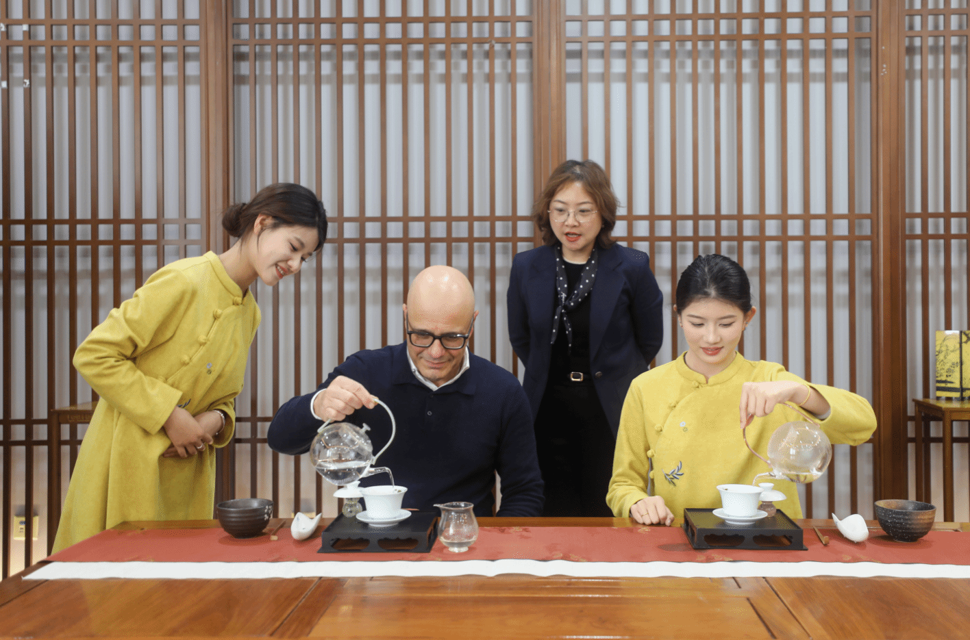 随后的实践环节将活动推向高潮。在“一对一”指导下,Mr. Casingena尝试自己用盖碗冲泡茶汤,虽然动作略显生涩,却格外认真专注。