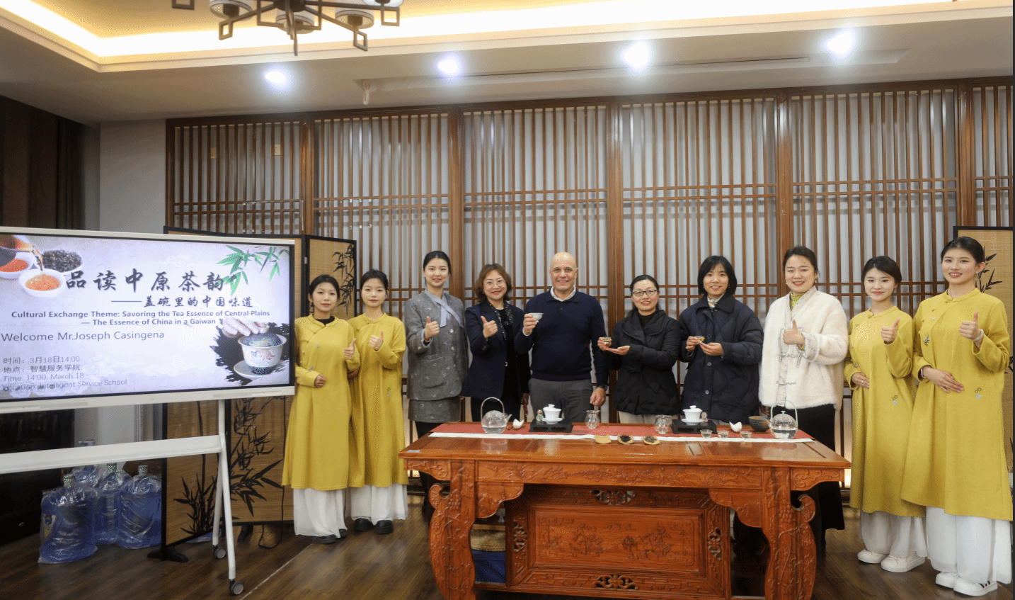 为深入推进“中文+职业技能”国际教育模式创新,探索中华优秀传统文化对外传播新路径,3月18日下午,智慧服务学院在茶艺实训室举办“品读中原茶韵——盖碗里的中国味道”国际文化交流活动。活动特邀马耳他旅游学院外籍教师Mr. Joseph Casingena沉浸式体验盖碗茶艺之美,感受中原茶韵之醇。智慧服务学院院长许向蒲、副院长魏俊巧、国际教育学院副院长张媛、茶艺与茶文化教研室全体教师共同参加活动。
