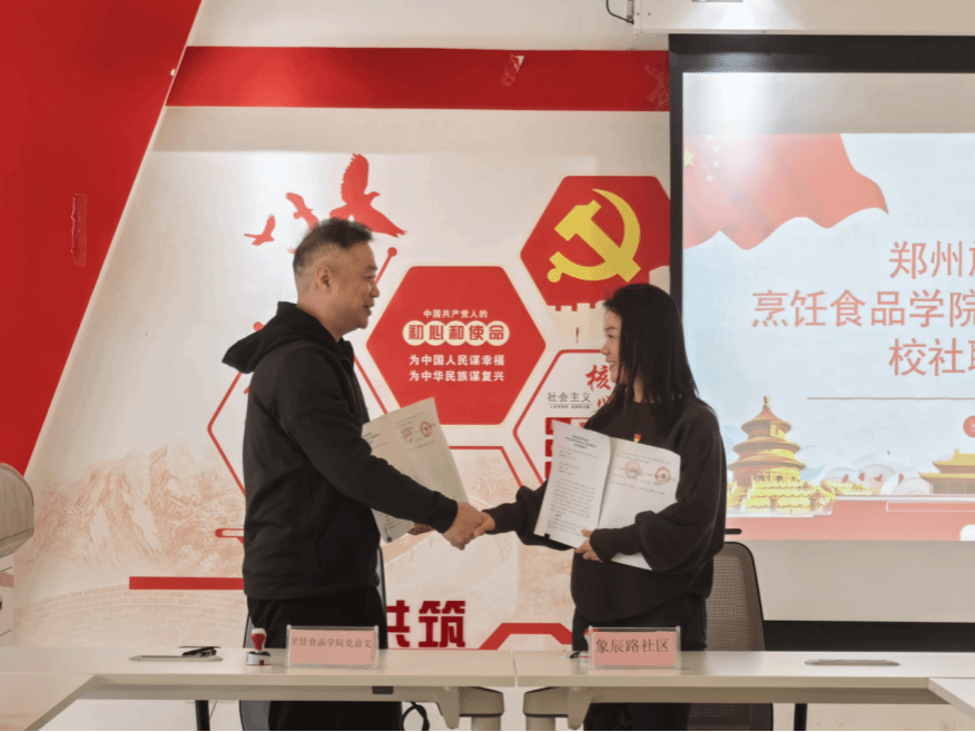 烹饪食品学院党总支田金毓致辞,介绍学院党建工作、专业特色与育人成果,阐述校社联建思路与规划。他表示,学院将发挥专业人才、教学资源等优势,以党建为纽带,推动专业教学与社区服务、社会实践结合,既助力社区民生服务提质,也为学生搭建实践育人平台。随后,象辰路社区书记宋娟致辞,介绍社区概况、党建亮点与居民服务需求。她指出,校社联建是创新基层党建、拓宽服务渠道的重要举措,社区将全力配合,引入高校优质资源赋能社区治理,推动形成校社联动、互利共赢的良好局面。双方签约代表上台签字、盖章并交换协议文本,全场共同见证这一重要时刻。