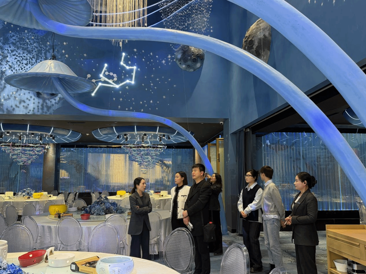 座谈会后,在张总的陪同下,许莹主任一行参观了酒店的婚宴大厅。参观过程中,双方结合婚庆行业实际场景,就场地布置、宴会流程设计、灯光音响配合等专业教学要点进行了现场交流与探讨。