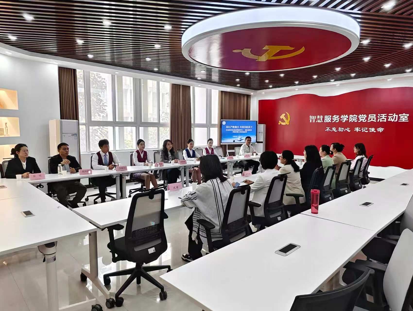 智慧服务学院院长许向蒲、党总支书记白娜、副院长魏俊巧、党总支副书记于婕、空乘教研室主任张莹出席座谈及聘任仪式,与受邀的行业专家齐聚一堂,共话民航人才培养新路径。座谈中,双方围绕空乘专业人才培养目标、课程体系优化、实践教学开展、岗位能力需求等核心议题深入交流。