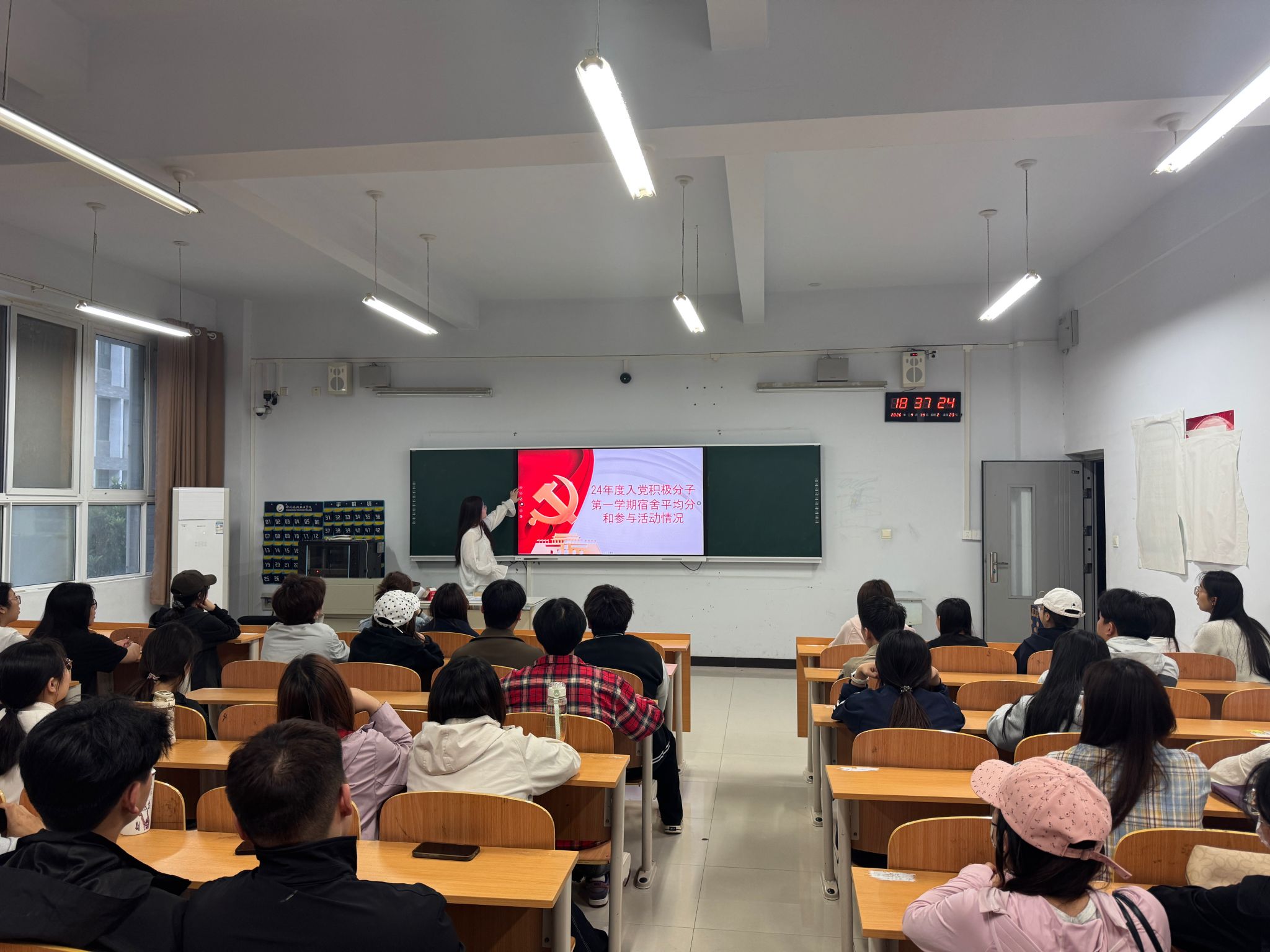 在活动开始前,学生助理孙一娟围绕宿舍文明、理论学习、实践参与、日常表现等四大维度,系统阐述了2024年度和2025年度入党积极分子上一学期的综合表现,全面展示了入党积极分子在思想淬炼、学风建设、生活作风、集体奉献等方面的成长与成效,并指出他们存在的问题与改进方向。