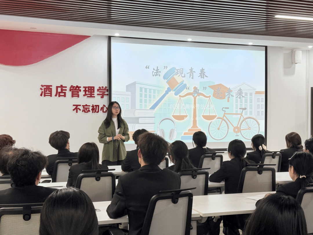为厚植校园法治文化,提升大学生法治观念与安全防范能力,酒店管理学院于4月17日举办“‘法’现青春,‘典’亮未来”为主题的沉浸式趣味普法宣传活动,辅导员张玙老师担任主讲,为全体学生带来一场干货满满的法治知识盛宴。
