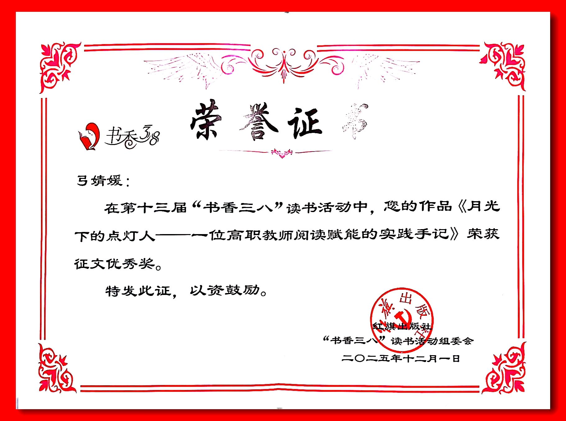 近日,第十三届“书香三八”读书活动获奖名单正式揭晓。我校人文科技学院教师弓婧媛的征文作品《月光下的点灯人——一位高职教师阅读赋能的实践手记》,从全国十万余件参赛作品中脱颖而出,荣获征文类作品优秀奖。