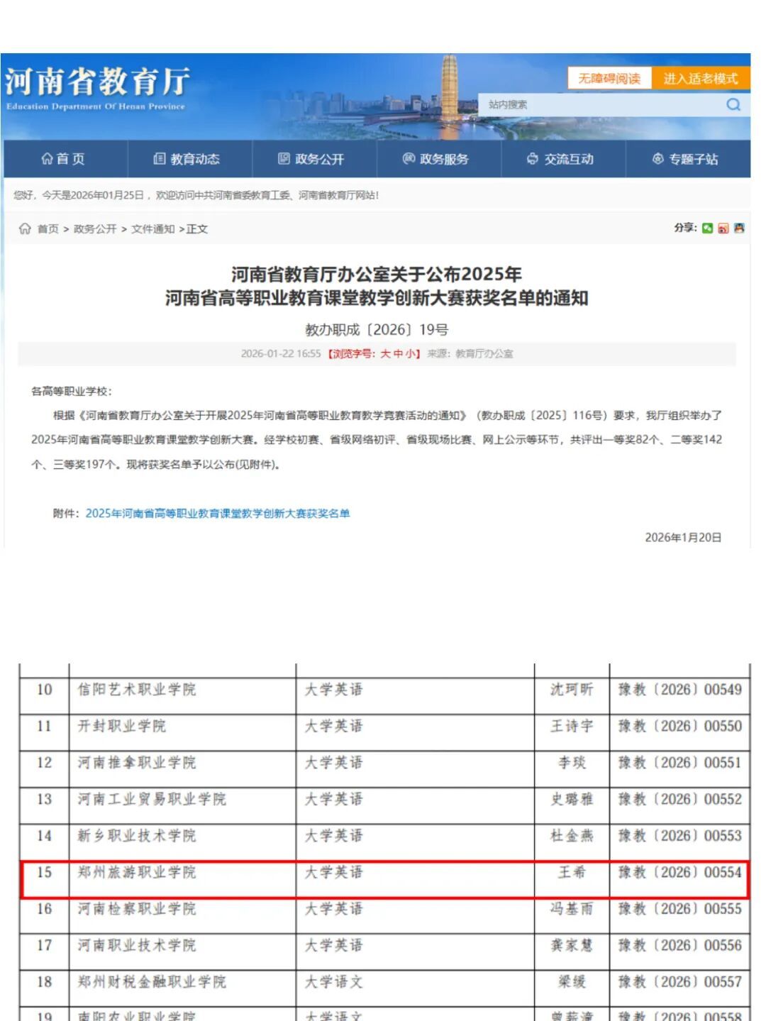 近日,河南省教育厅正式公布2025年高等职业教育课堂教学创新大赛获奖名单,国际旅游学院青年教师王希主讲的《大学英语》课程(主题“以礼相待 以心相导”)成功斩获省级二等奖。
