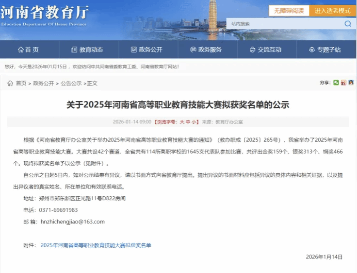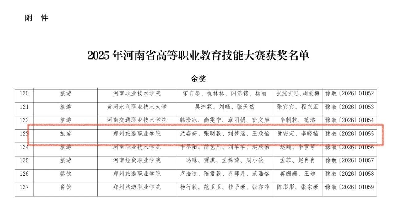 2025年12月18日-19日,2025年河南省高等职业教育技能大赛旅游赛道比赛在河南职业技术学院举办,来自全省56所高职院校的57支参赛队、220名旅游类专业学子同台竞技,展开激烈角逐。我校由旅游管理学院25级学生张明毅、王欣怡、刘梦涵、武姿妍四名同学组成的参赛队,在黄安定、李晓楠两位老师及大赛辅导团队的指导下,荣获大赛金奖。