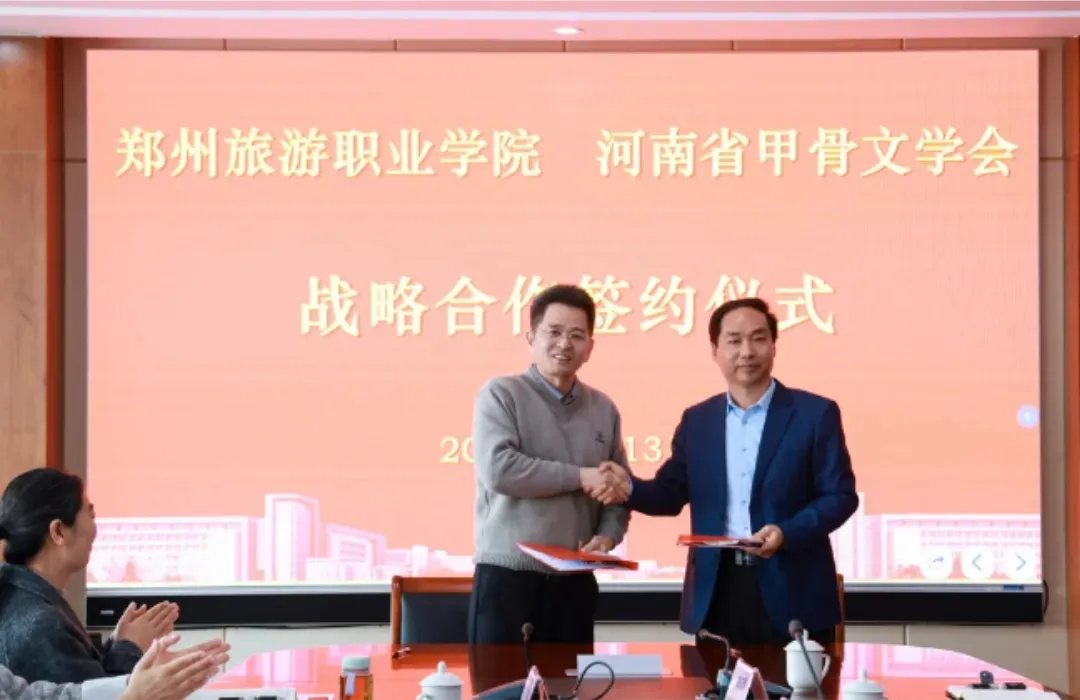3月13日上午,郑州旅游职业学院与河南省甲骨文学会战略合作签约仪式在该校举行。校长肖世才、副校长张建军、合作发展处处长朱宇、数字文创学院院长韩志孝、图书馆馆长胡志霞,河南省甲骨文学会会长曹建墩、执行会长张红梅等双方相关负责同志出席签约仪式。