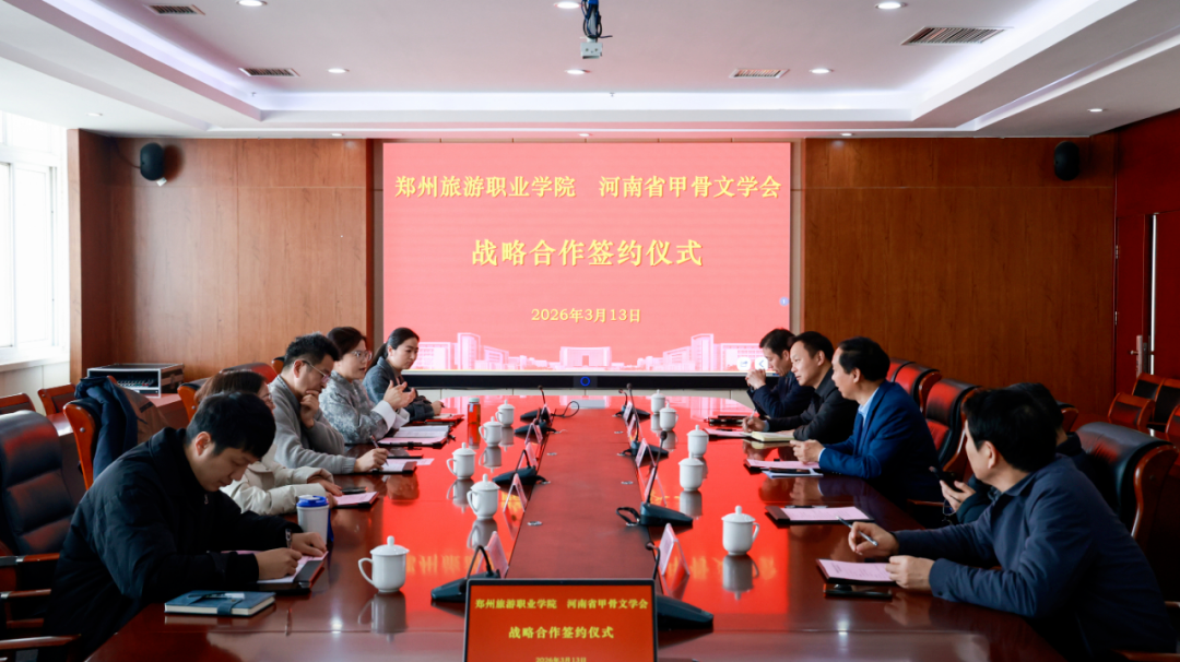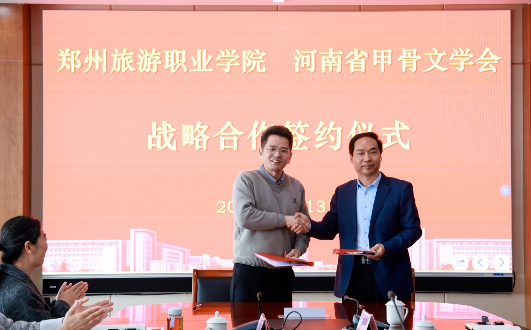 3月13日上午,郑州旅游职业学院与河南省甲骨文学会战略合作签约仪式在该校举行。院长肖世才、副院长张建军、合作发展处处长朱宇、数字文创学院院长韩志孝、图书馆馆长胡志霞,河南省甲骨文学会会长曹建墩、执行会长张红梅等出席签约仪式。