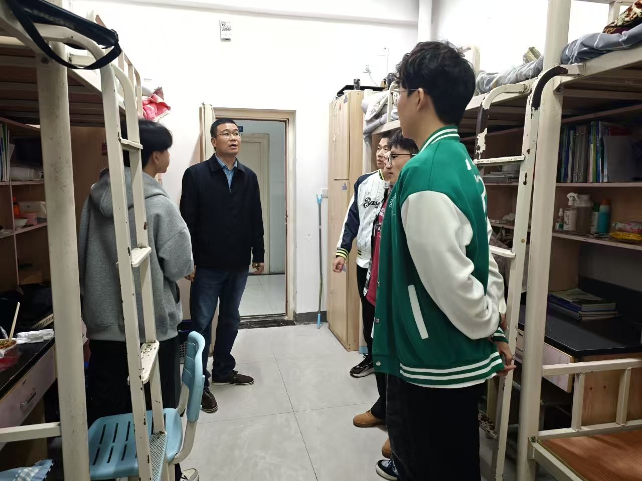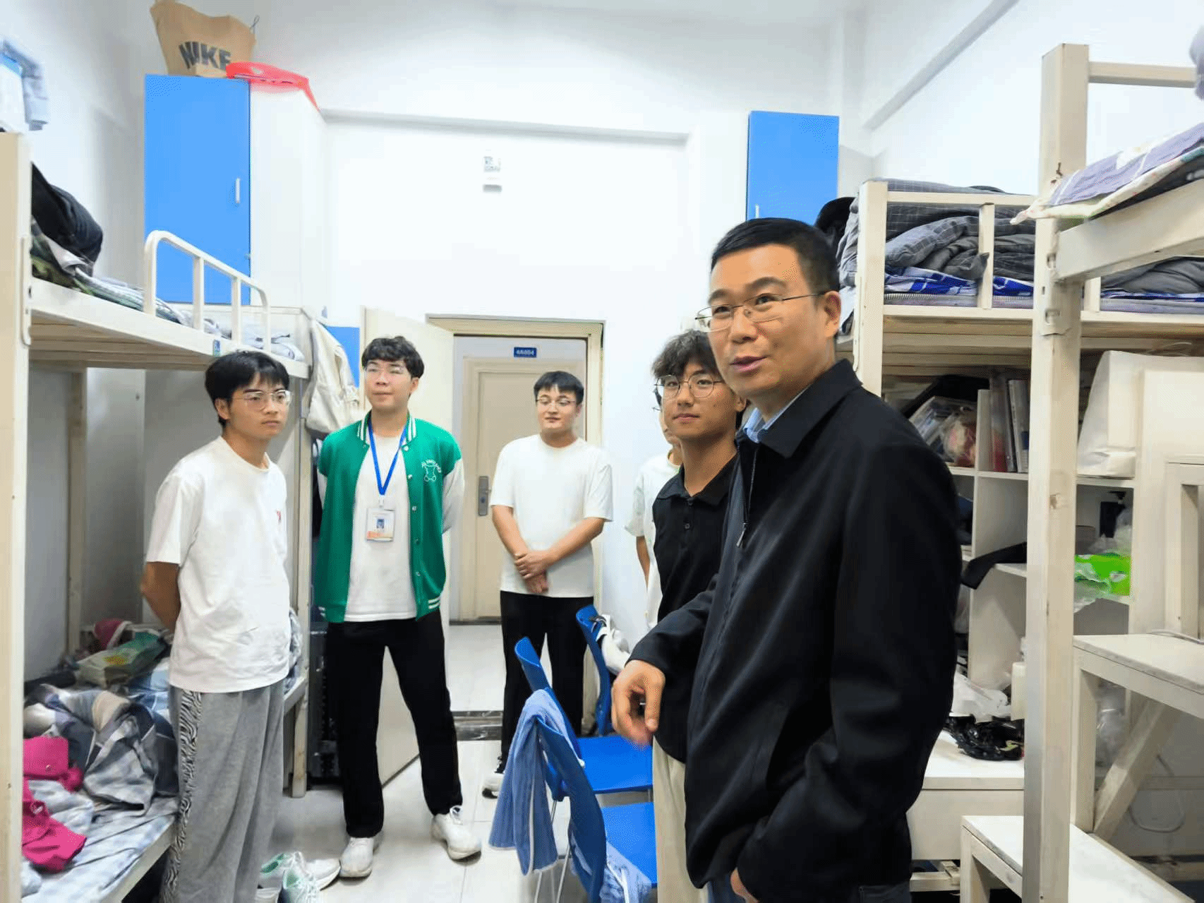 走访过程中,张培彦轻步走进每一间宿舍,首先细致查看了宿舍的住宿环境,从床铺整理、物品摆放,到水电设施、通风采光,每一处细节都仔细询问,叮嘱同学们要保持宿舍整洁卫生,养成良好的生活习惯,同时注意用电安全,杜绝违规电器使用,共同营造安全、舒适、和谐的住宿氛围。