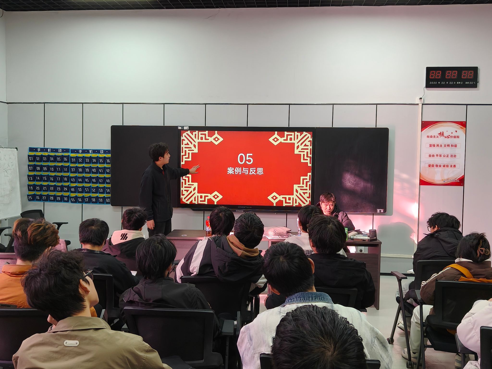班会现场,团支书们通过PPT演示、宪法条文解读、典型案例分析等形式,系统讲解宪法核心内容与重要意义,结合校园生活实际,将宪法精神与校纪校规有机融合。班主任针对学生关注的权益保护、违纪处理等问题进行补充说明,引导学生树立“知法于心、守法于行”的理念,鼓励大家主动参与宪法学习实践。