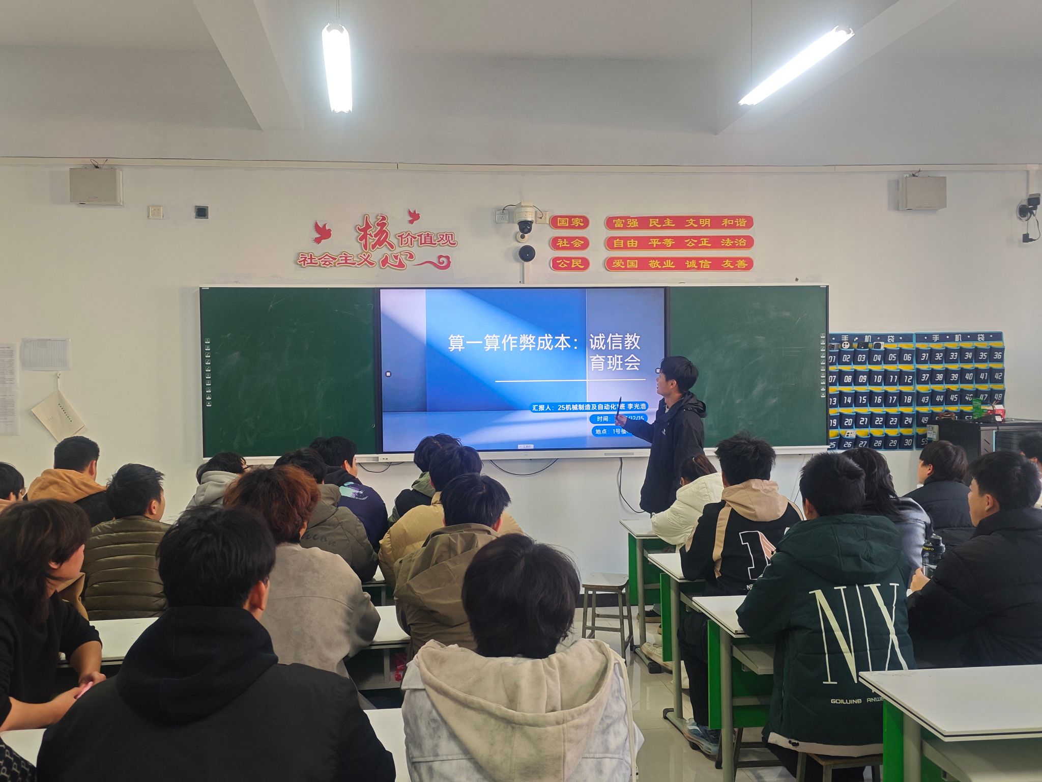 为强化学生诚信意识,营造风清气正的校园氛围,12月16日,智能工程学院组织各班开展“诚实守信教育——算一算作弊成本”主题班会。本次班会由各班团支书主持,班主任全程指导,全体学生积极参与。