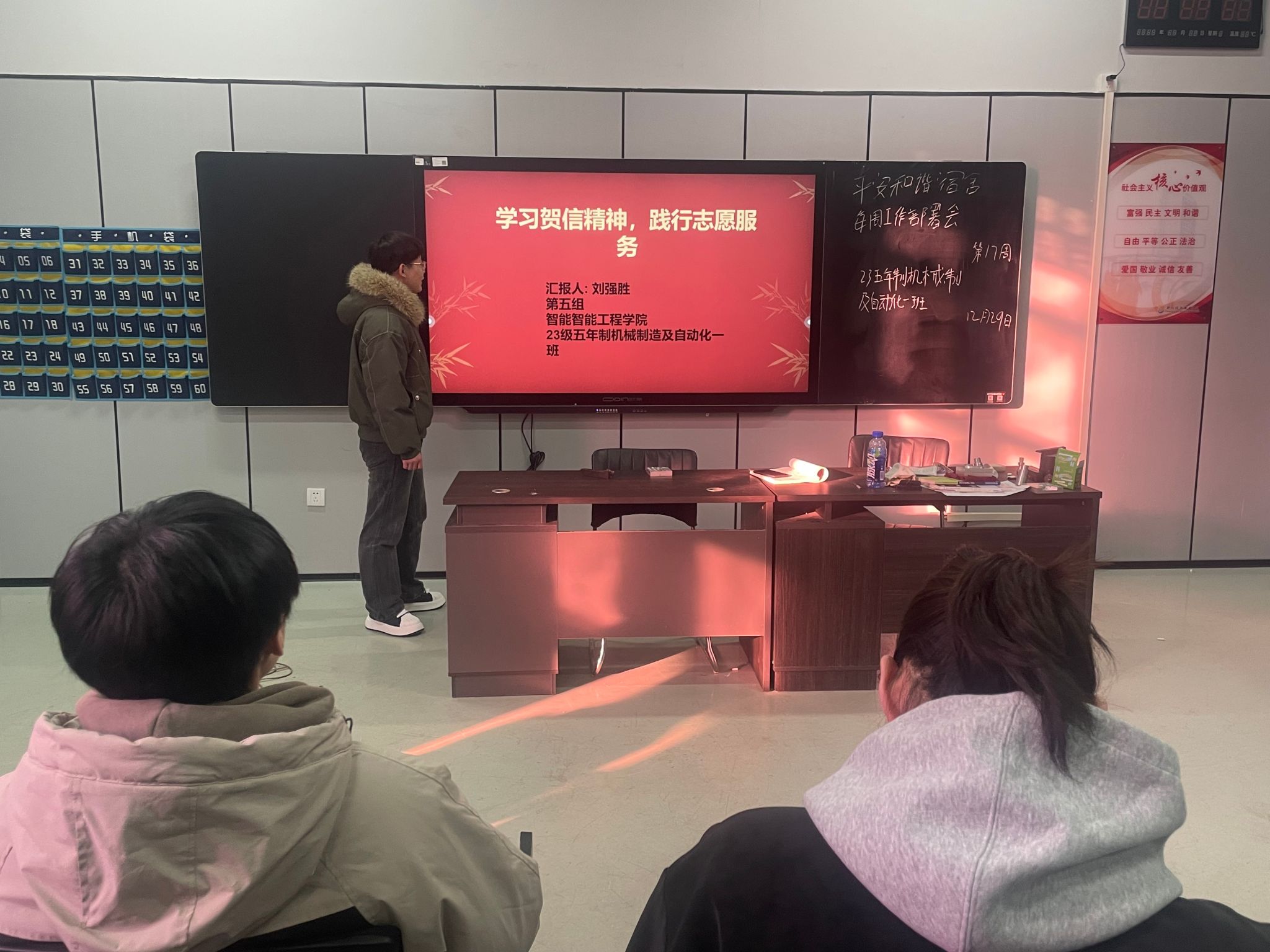 为深入学习贯彻贺信精神,引导青年学子厚植家国情怀,主动践行志愿服务精神,12月29日,智能工程学院组织各班级开展“学习贺信精神,践行志愿服务”主题班会,本次班会由各班团支书主持。