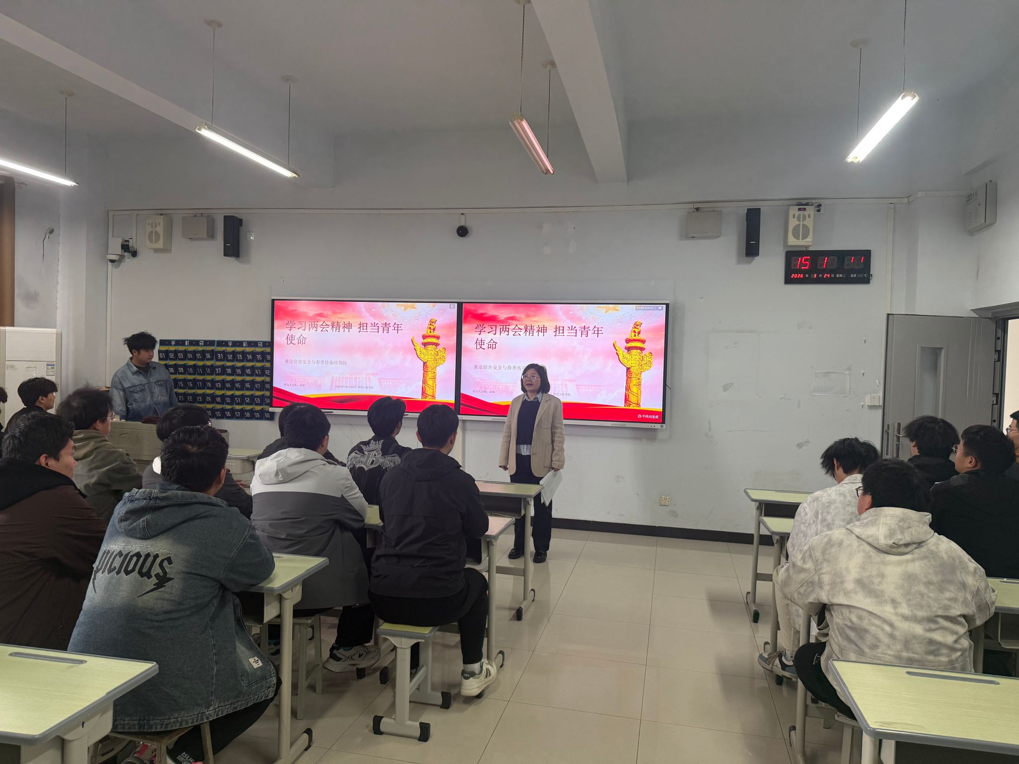 班会中,团支书围绕两会召开意义、重要议程、核心内容进行讲解,带领同学们认真学习政府工作报告中的新思想、新部署、新要求。班主任结合学院专业特色与学生成长实际,对学习内容进行补充解读,鼓励同学们关注国家发展,坚定理想信念,树立正确的世界观、人生观、价值观。