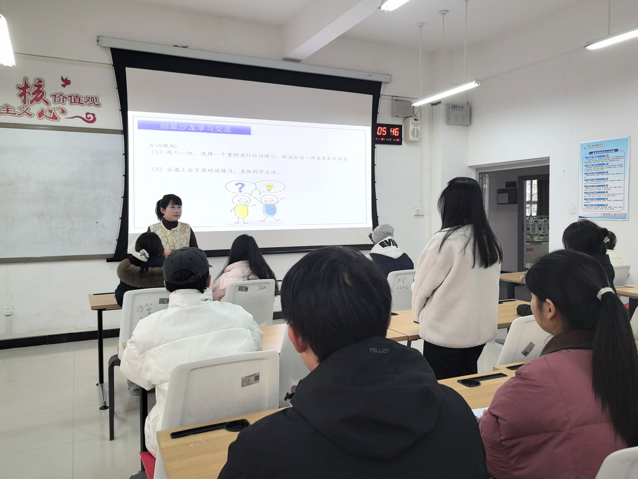 酒店管理学院闫艳老师围绕“朋辈心理互助的技巧与边界”这一主题展开了深入浅出的讲解。结合大学生实际生活中常见的人际交往、情绪管理、学业压力等现实问题,通过生动的案例剖析,详细阐述了同学们如何运用倾听、共情、积极关注等技巧与同学建立信任关系。她特别强调,要能够敏锐观察身边同学的心理状态变化,及时发现潜在危机信号,同时必须清晰认识自身能力的边界,不做超越能力的“心理咨询”,而是要及时、有效地向辅导员或专业心理咨询老师报告和转介。在随后的自由交流与案例研讨环节,大家结合自身在生活中遇到的困惑和难题,进行了积极的分享和讨论。