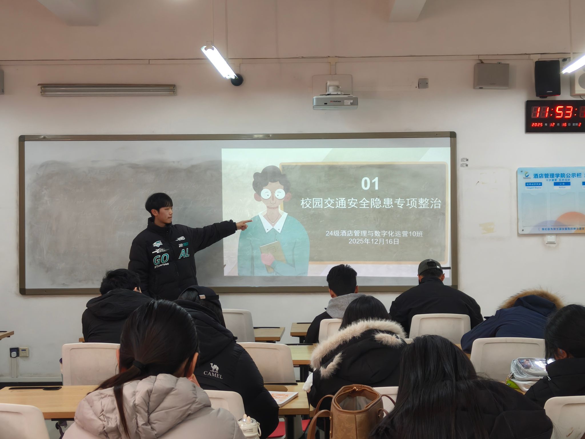 为了加强校园周边交通秩序,保障师生出行安全,提升全体师生及入校驾驶员的交通安全意识和自我保护能力,酒店管理学院于本周组织召开“校园交通安全隐患专项整治活动”的主题班会。