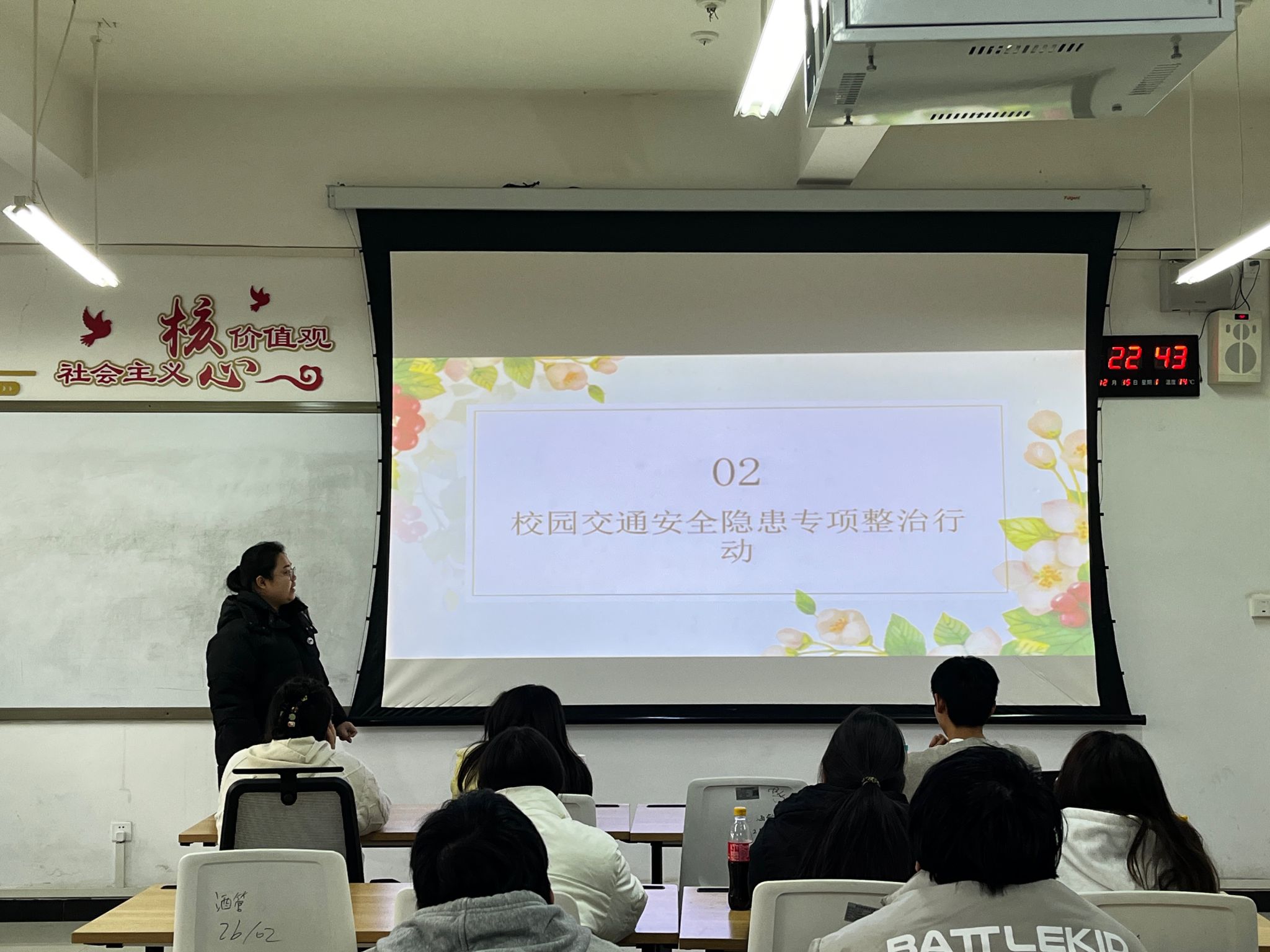 在班会上,班主任紧扣校园交通安全主题,有序开展系列宣传教育活动。先是组织学生们学习交通法规及学校交通管理规定,重点明确校园内限速、礼让行人、规范停车等核心要求,严肃强调酒驾、超速、违规占用应急通道等行为的危害。随后通过典型案例警示教育、安全知识互动讲解等形式,帮助同学们深化对交通规则的理解,掌握事故应急处置方法,进一步树立“文明出行、安全第一”的理念,自觉抵制交通陋习。
