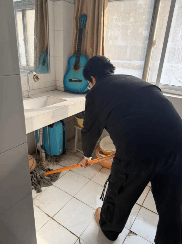 3名同学利用扫帚、拖把、抹布、垃圾袋等清洁工具,按照分工,进行细致的打扫工作。同学们干劲十足,有人仔细清扫地面,不放过任何一个角落的灰尘和纸屑;有人负责清理洗漱间台面和水池;还有人负责收拾宿舍垃圾,倒入指定垃圾投放点……在大家的共同努力下,整个宿舍楼的面貌焕然一新。