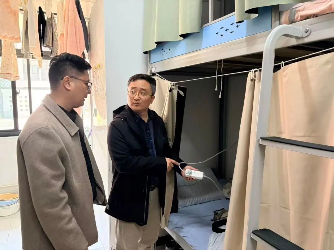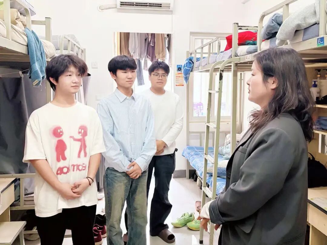 走访过程中,老师们深入每一间宿舍,重点围绕违禁品排查、公共设施安全检查、宿舍卫生整治三大核心内容展开细致检查。领导和老师们逐一查看宿舍床铺、柜子、桌子下方等隐蔽角落,严格排查各类违规违禁物品,向学生普及违禁品的危害及相关管理规定,引导学生自觉遵守宿舍管理条例。同时,针对宿舍卫生情况进行全面检查,督促学生及时清理生活垃圾,整理个人物品,保持宿舍内部干净整洁、通风良好,养成良好的生活习惯。