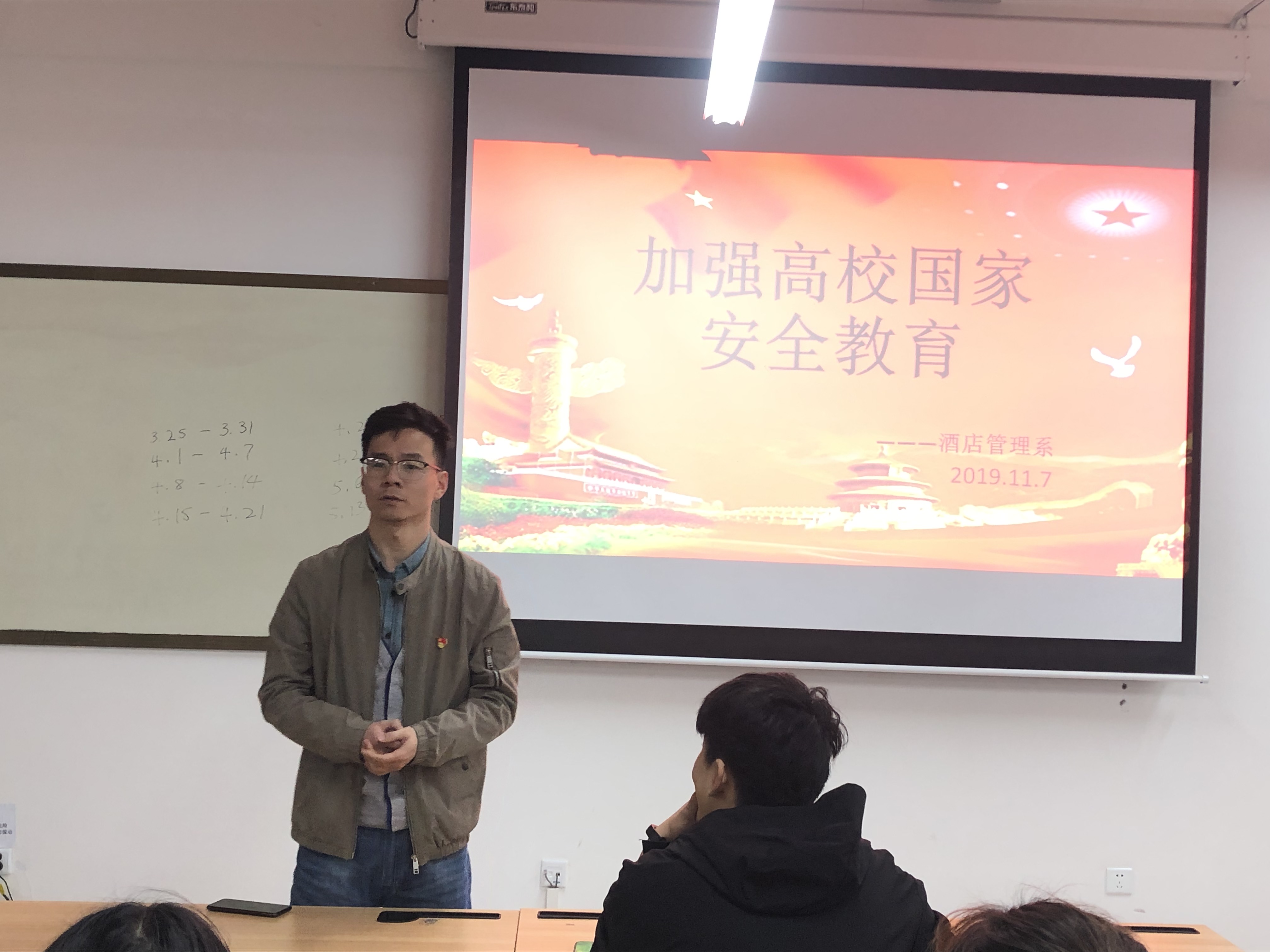 为深入学习宣传习近平总书记在国家安全工作座谈会上的重要讲话精神,领会中央精神,提高思想认识,引导学生牢固树立总体国家安全观,提升广大学生依法履行维护国家安全、荣誉和利益义务的自觉性,2019年11月7日,酒店管理学院在2b302教室组织召开了"加强高校国家安全教育"专题会议。本次会议由牛亚飞老师主持,学生会部分成员及2018、2019级各班安全委员参加。