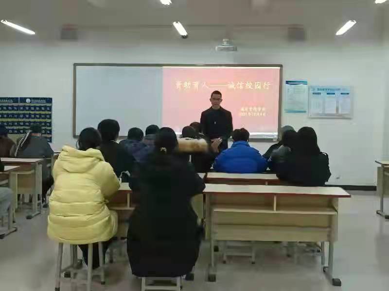 为深入贯彻党的十九届六中全会精神,全面实施高校思想政治工作质量提升工程,扎实推进社会主义核心价值观培育践行,进一步加强和改进大学生思想政治教育,倡导文明新风,强化大学生的诚信意识,引导学生加强自身道德修养,树立自重、自省、自警、自励,求真务实、言行一致的诚信形象,根据学院实际,酒店管理学院于2021年12月8日在2号教学楼B座组织“资助育人——诚心校园”行活动,酒店管理学院党总支书记陈海彬出席会议,会议由韩瑞新老师主持。