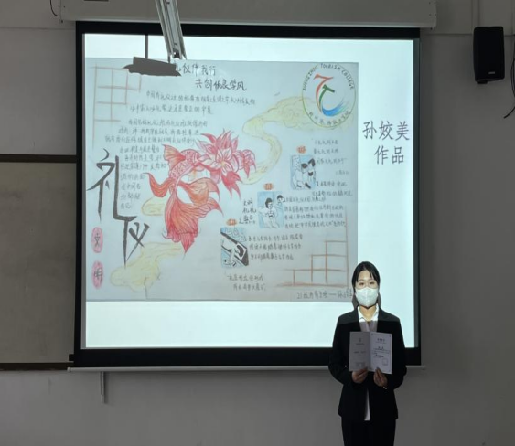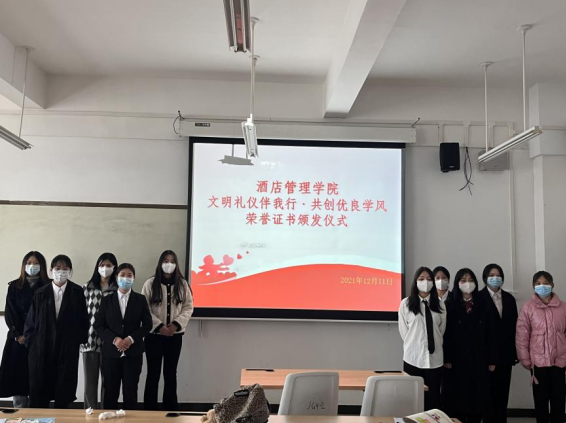 酒店管理学院“文明礼仪伴我行,共创优良新学风”优秀创作活动暨优秀作品选拔投票活动-你pick谁中,共有23幅作品参赛。结合线上与线下的投票情况,选出了9幅优秀代表作品,并于12月11日下午在2B402教室举行“文明礼仪伴我行,共创优良新学风”荣誉证书颁发仪式。