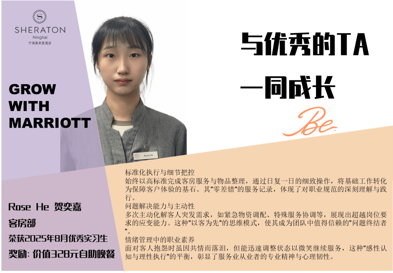 三个月前,我怀着对未来的憧憬与一丝忐忑,踏入了宁海喜来登酒店客房部送物员的岗位。这段经历,宛如一部精彩的成长纪录片,每一帧都铭刻着我的蜕变与足迹。