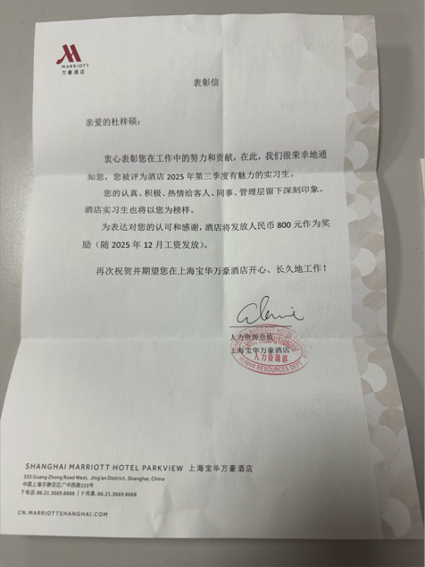 非常荣幸能获得“优秀实习生”的称号,这份认可不仅属于我,也属于在上海宝华万豪酒店前台的每一位耐心指导我的同事和始终支持我的学校。