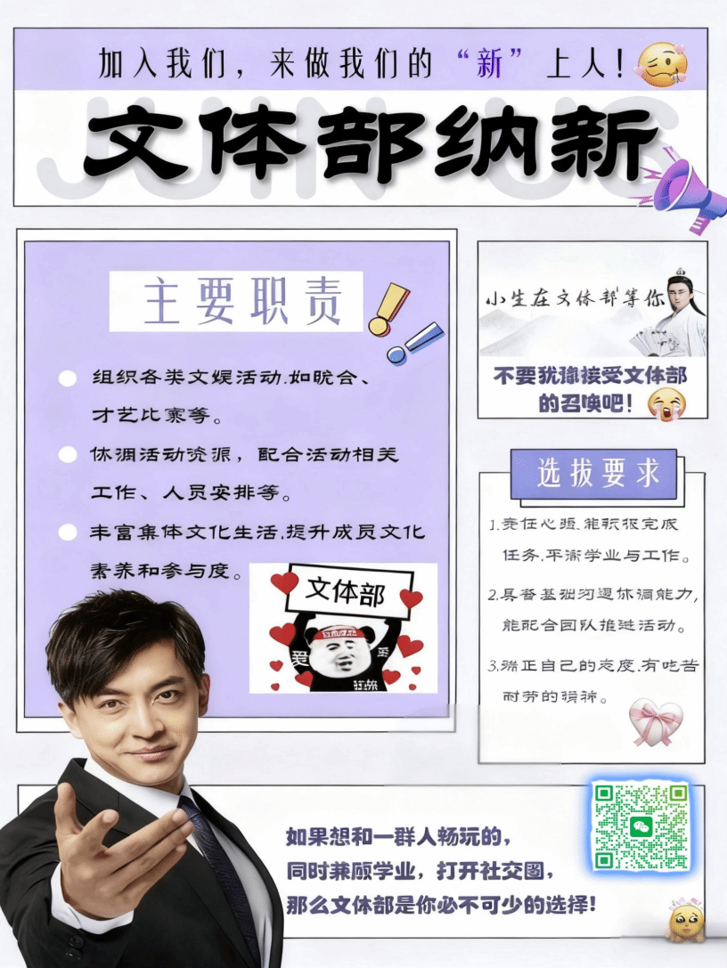 学生会学习部为热爱学习、乐于服务的新生搭建平台。部门负责管理考试、早阅读等事务,让学习生活井井有条;同时协助举办各类活动,让大家在实践中积累经验、锻炼沟通能力。期待有能力、有素质、心理强大的2025届新生加入,一起做“沟通小达人”,在学习与成长的道路上并肩前行!