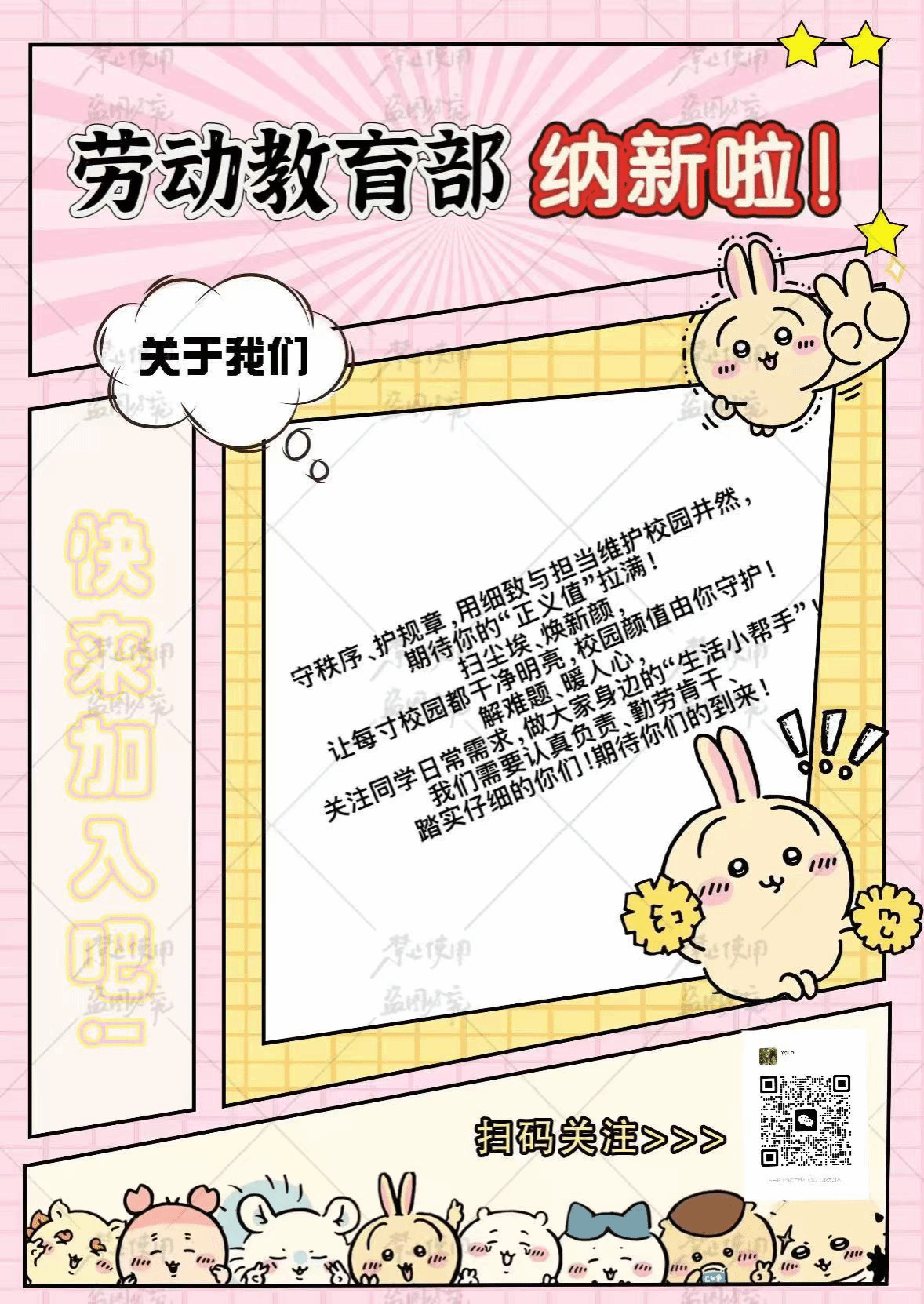 劳动教育部以“守秩序、护规章,用细致与担当维护校园井然”为使命,致力于让校园干净明亮,解决同学日常难题。部门需要认真负责、勤劳肯干、踏实仔细的同学,一起做大家身边的“生活小帮手”,在维护校园环境、服务同学的过程中,践行劳动精神,收获成长与认可!