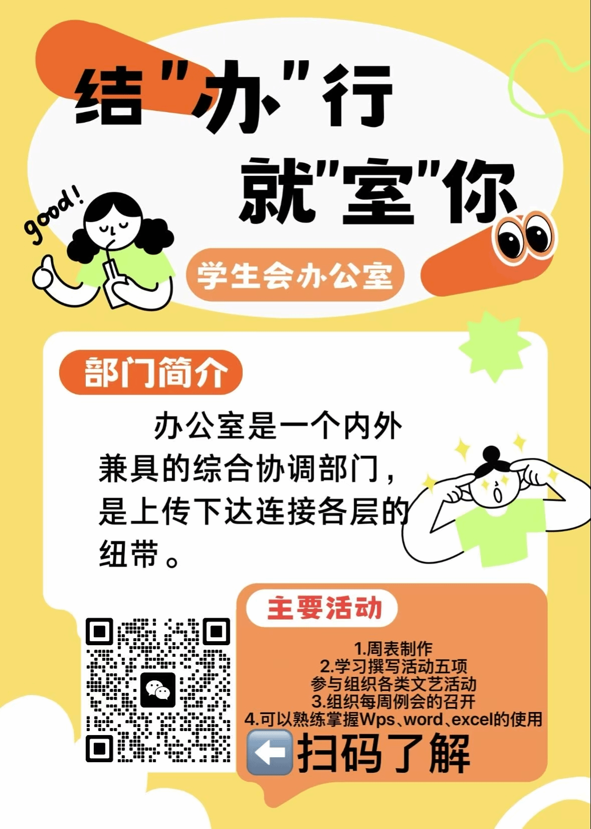 在这里办公室是上传下达的纽带,主要负责周表制作、活动五项撰写、每周例会组织等工作,同时要求成员熟练掌握Wps、word、excel等办公软件。如果你想锻炼综合协调能力,成为学生会的“中枢大脑”,办公室欢迎你的加入!