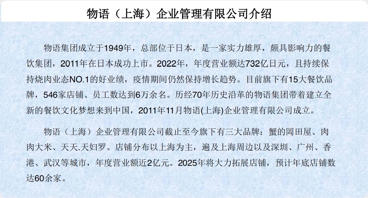 物语集团1949年创立于日本,2011年在日本上市,旗下有15大餐饮品牌。2011年,物语(上海)企业管理有限公司成立,目前旗下拥有蟹的岡田屋、肉肉大米、天天·天妇罗三大品牌,店铺分布于上海及国内多个城市,2025年计划拓展至60余家。